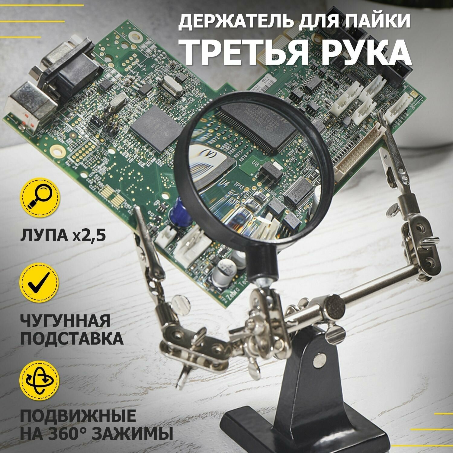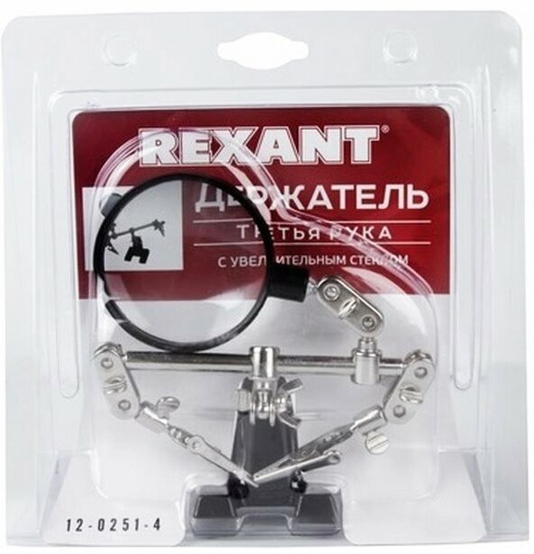 Держатель «третья рука» с лупой х2.5 REXANT служит, главным образом, при проведении паяльно-сборочных работ в электронике, ювелирном деле, сборке и ремонте для зажима мелких деталей в любом нужном положении, когда не хватает двух рук.