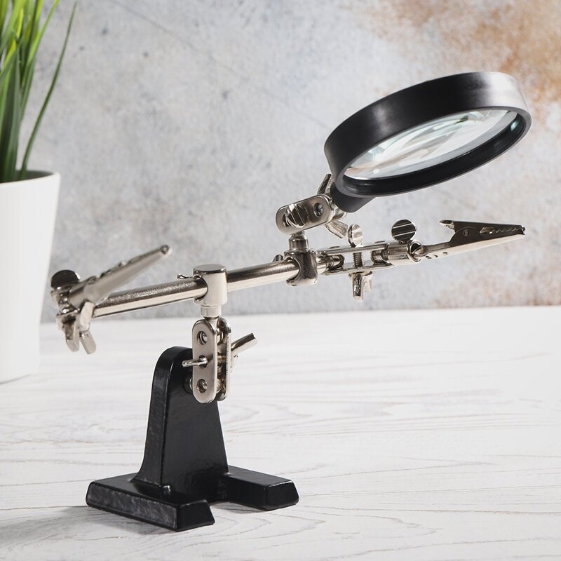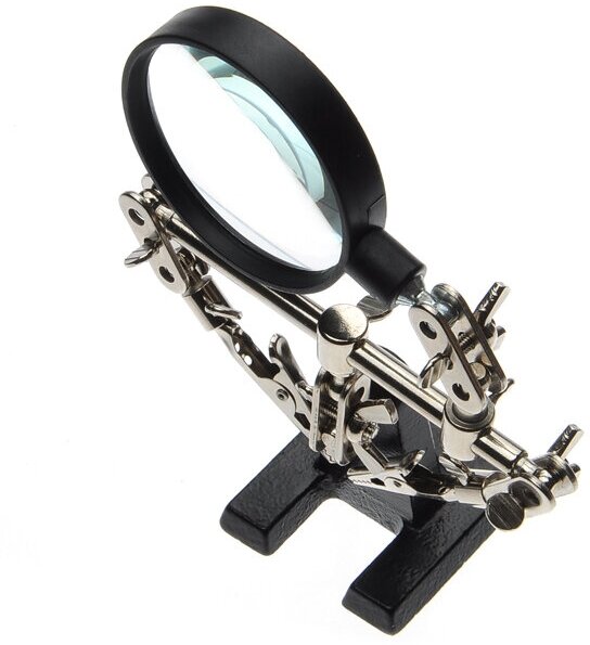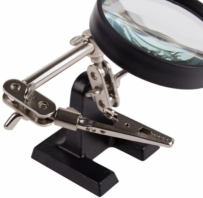 Третья рука идеальный помощник, при работе с мелкими деталями,когда не хватает двух рук. Модель с 2.5-кратным увеличением (возможность регулировки положения, диаметр линзы 60 мм). С помощью лупы можно будет рассмотреть даже самые мелкие детали.