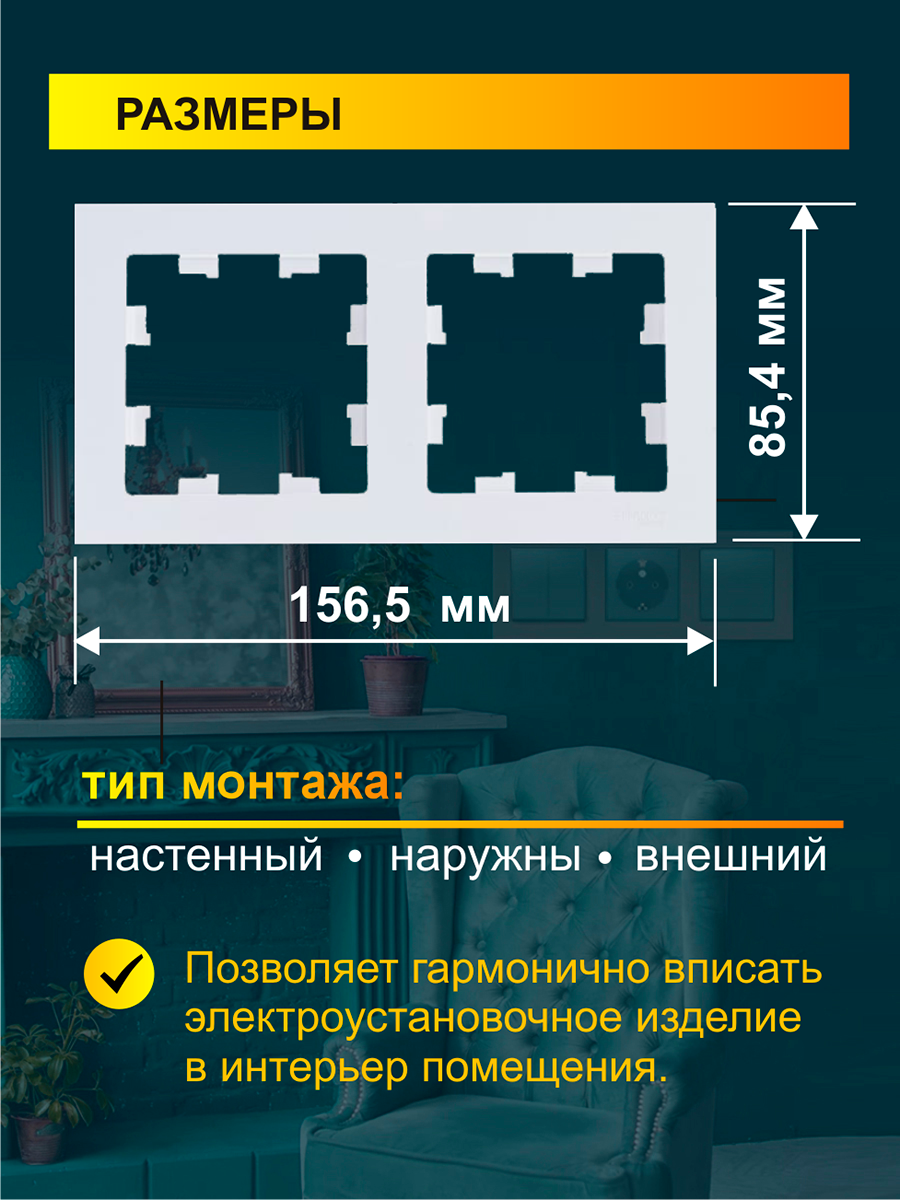 Устройство Рамка SE AtlasDesign Nature 2 поста, матовое органическое стекло белый Артикул: ATN330102 Schneider Electric Двухпостовая рамка Шнайдер Электрик из матового стекла белого цвета Данный аксессуар от компании Schneider Electric из коллекции AtlasDesign подсерии Nature представляет собой двухпостовую рамку для розеток и выключателей, которая является одновременно элементом декора, улучшающим вид электроустановочного оборудования, и изделием, защищающим от пыли, грязи и влаги. Именно рамка позволяет придать системе электроснабжения в жилом или офисном помещении законченный вид. Она рассчитана на 2 поста инсталляции, что является удобным и практичным решением. Цвет рамки – белый – базовый вариант для дизайнеров при создании интерьеров. Он освежает пространство и является актуальным вне времени. Материалом изготовления выступает матовое органическое стекло, которое приятно на ощупь и не оставляет отпечатков пальцев. Оно нежно и красиво смотрится в любом интерьере. Двойная рамка имеет форму прямоугольника. Ее простая и легкая фиксация производится через 4 точки крепления. Четкие линии характеризуют классический стиль исполнения модели. Габаритные размеры изделия: 156.5х85.4х11.1 мм, расстояние между центрами – 71 мм, вес – 56 г.