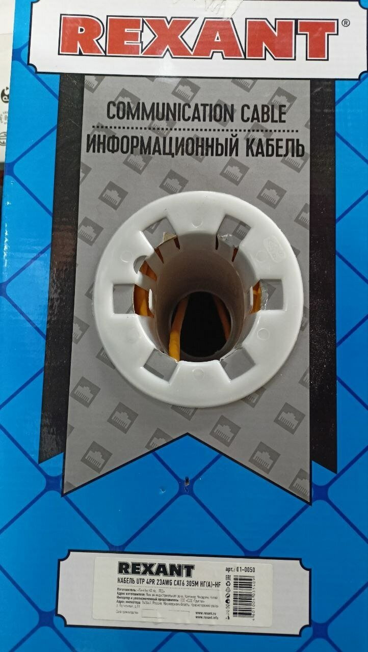 Кабель UTP 4PR 23AWG, CAT6 нг(А)-HF (бухта 305 м) REXANT. Неэкранированная витая пара, материал проводника — высокоочищенная бескислородная медь, калибр (23 AWG). Материал оболочки — нг(А)-HF, огнестойкий, не распространяющий горение при групповой прокладке, безгалогенный композит, пониженной пожарной опасности с низкой коррозионной активностью продуктов горения и тления.