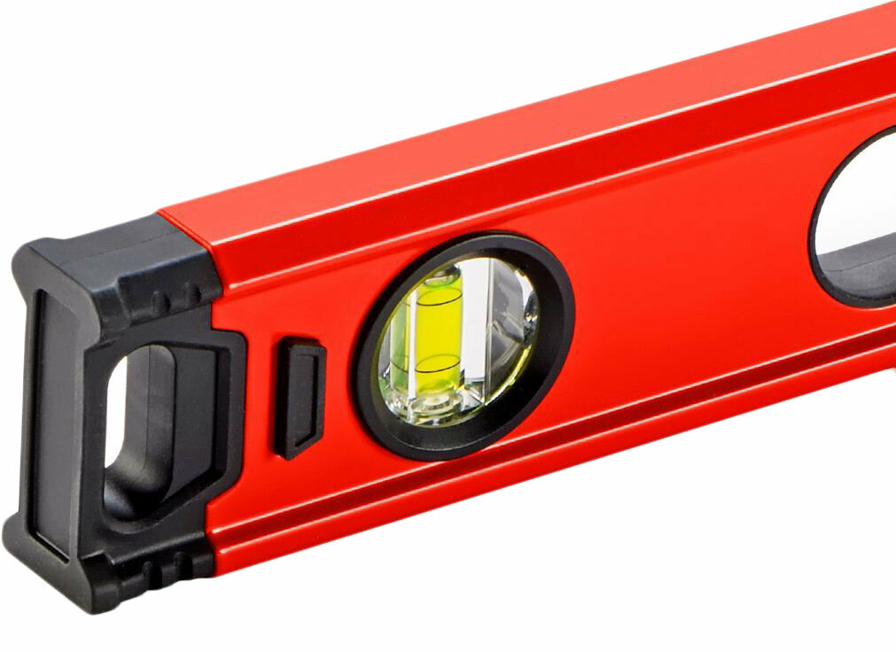 Алюминиевый уровень с усиленной конструкцией профиля выявляет отклонение поверхности по вертикали и горизонтали.