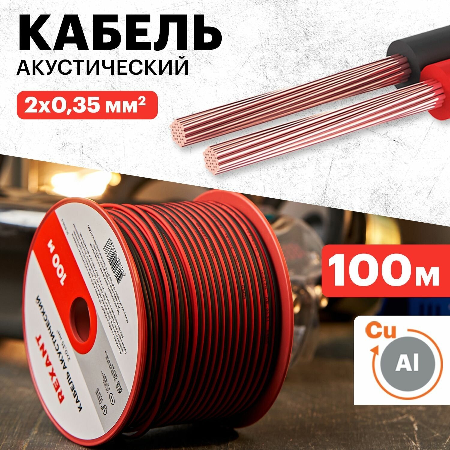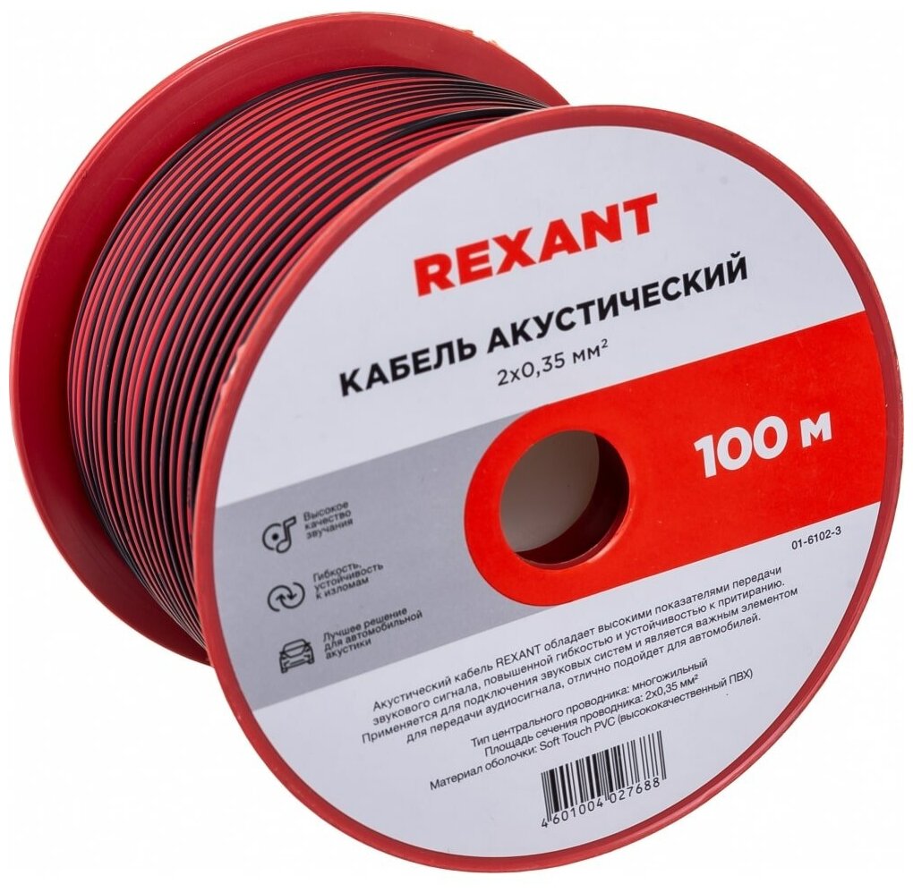 Акустический кабель 2х0,35 мм? REXANT состоит из двух параллельных многожильных проводников в изоляции из поливинилхлоридного пластиката красного и черного цвета. Разделительное основание позволяет обеспечить разделение проводников кабеля без повреждения изоляции и оголения жил.