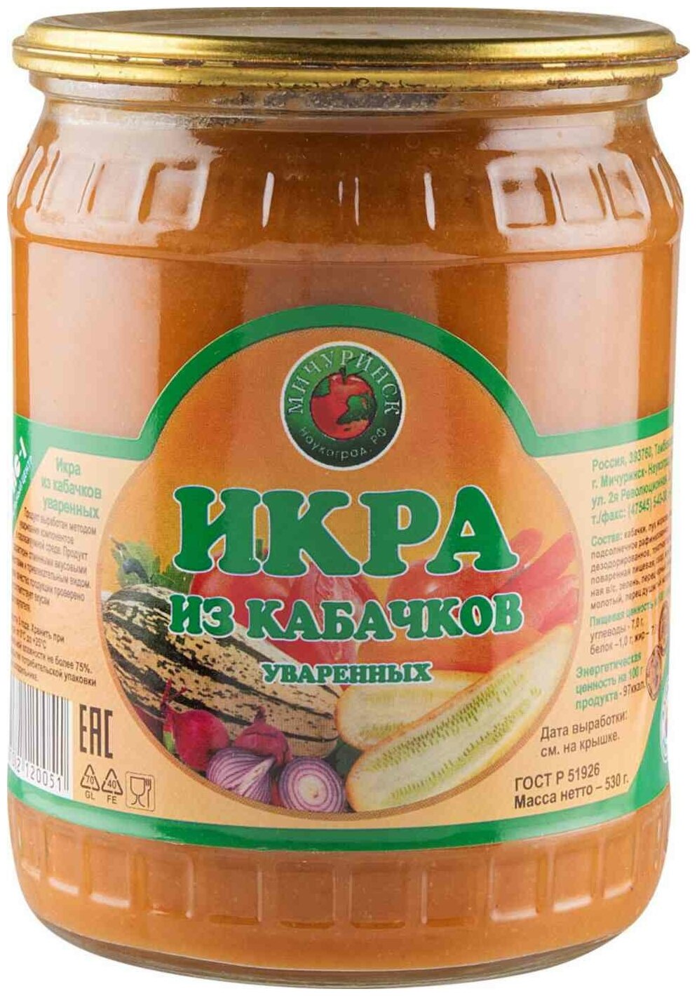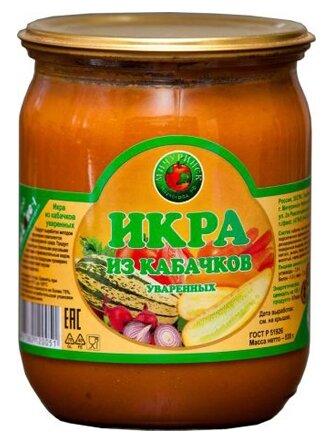 | Состав | кабачки, лук, морковь, масло подсолнечное рафинированное дезодорированное, томатная паста, соль поваренная пищевая, сахар, мука пшеничная высшего сорта, зелень, перец черный горький молотый, перец душистый молотый |