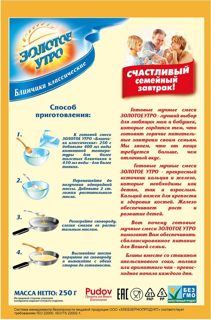 Смесь для выпечки Золотое утро блинчики классические 250 г позволяет быстро и без хлопот сделать питательный завтрак или легкий перекус для всей семьи. Производится из пшеничной хлебопекарной муки высшего сорта.
