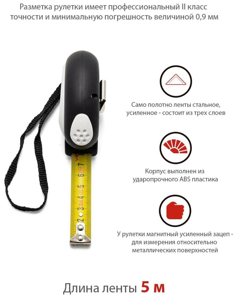 Рулетка для любителей комфортной работы. Мы сделали рулетку овальной формы и покрыли её защитным обрезиненным слоем, чтобы она идеально помещалась в ладонь. Вы не будете замечать её при работе. Данная модель имеет длину ленты 5 метров, ширину - 19 мм.
