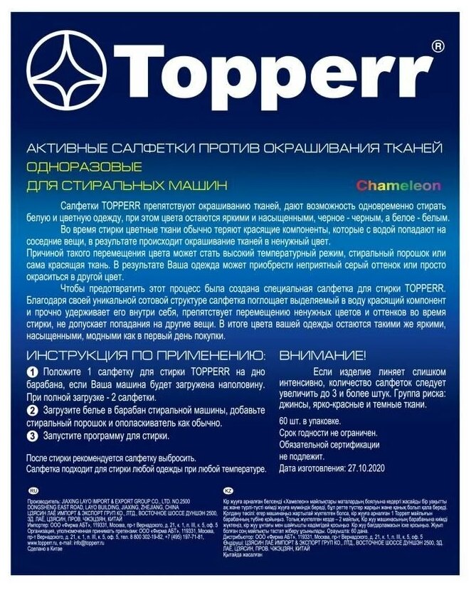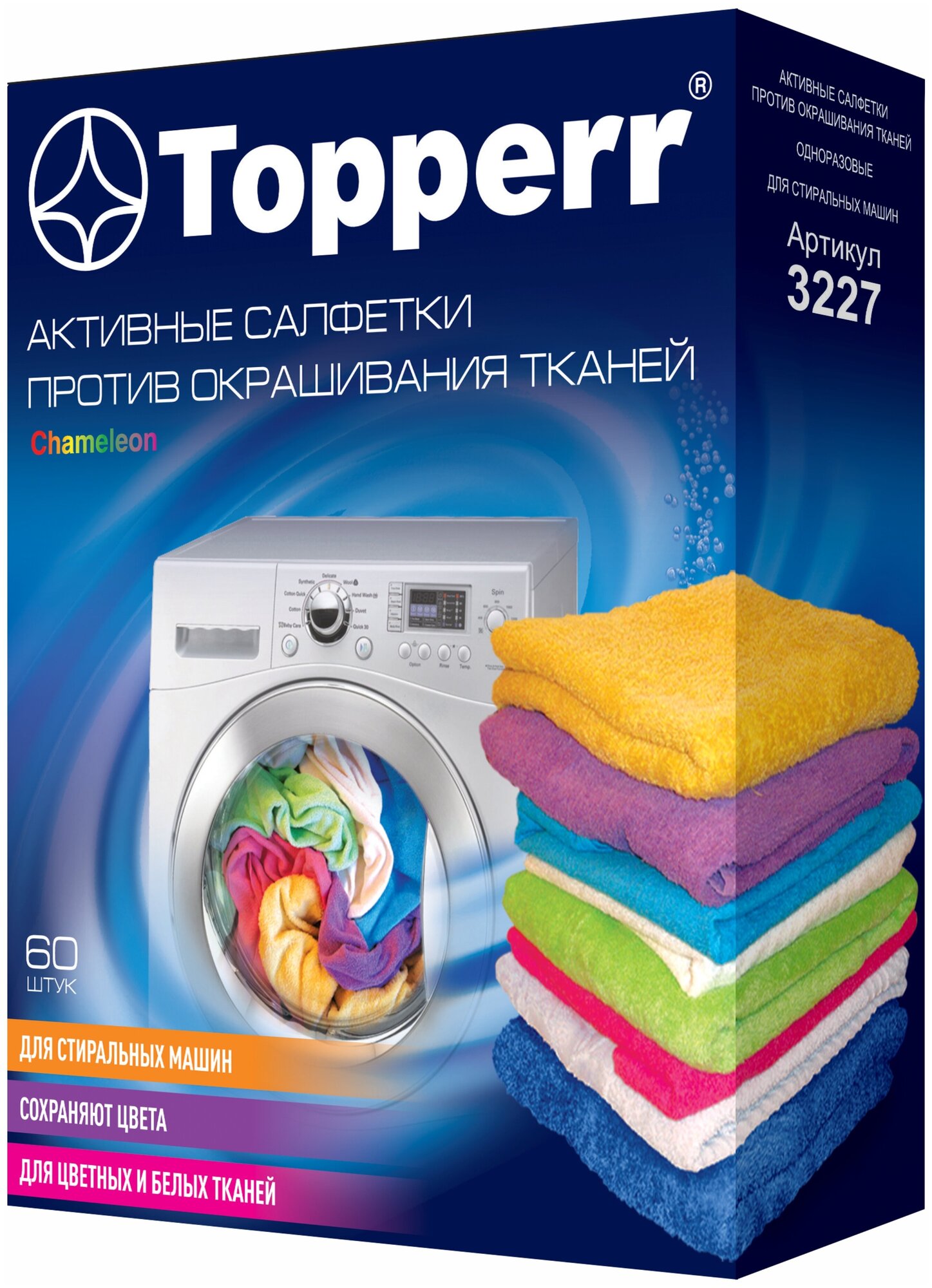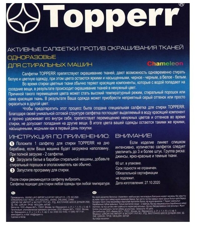 Что сделать чтобы вещь не красилась? Как постирать красящиеся вещи? При стирке окрасилась вещь, что делать? Если вас волнуют эти вопросы, то стирка черно белых вещей, а также цветных одновременно кажется вам невозможной. Но что, если мы скажем, что стирка бело черных и цветных вещей возможна?Активные салфетки для стирки «Хамелеон» Topperr 3207 препятствуют окрашиванию тканей, дают возможность одновременно стирать белую и цветную одежду, при этом цвета остаются яркими и насыщенными, черное - черным, а белое - белым.Больше не нужно сортировать одежду по цветам перед стиркой! С салфетками для стирки Хамелеон вы можете одновременно постирать ваше любимое белое платье, цветную блузку и пляжное полотенце – белое останется белым, цветное цветным, а черное черным!Способ применения:Положите 1 салфетку для стирки Topperr на дно барабана, если Ваша машина будет загружена наполовину. При полной загрузке – 2 салфетки.Загрузите белье в барабан стиральной машины, добавьте стиральный порошок и ополаскиватель как обычно.Запустите программу для стирки.После стирки рекомендуется салфетки магниты для стирки выбросить.Теперь вы знаете что делать, если при стирке окрасилась белая вещь. Стирать красящиеся вещи нужно с салфетками от окрашивания при стирке Topperr.В упаковке: 20 шт.