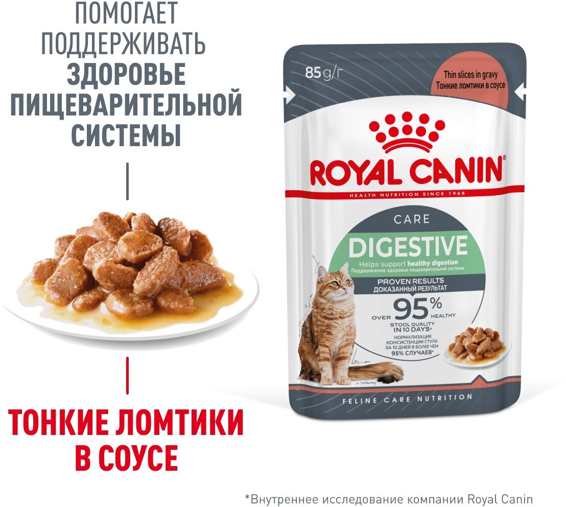 ROYAL CANIN® Digest Sensitive в соусе – высокоусвояемое питание для кошек с чувствительной пищеварительной системой. Белки LIP в составе способствуют уменьшению запаха фекалий.