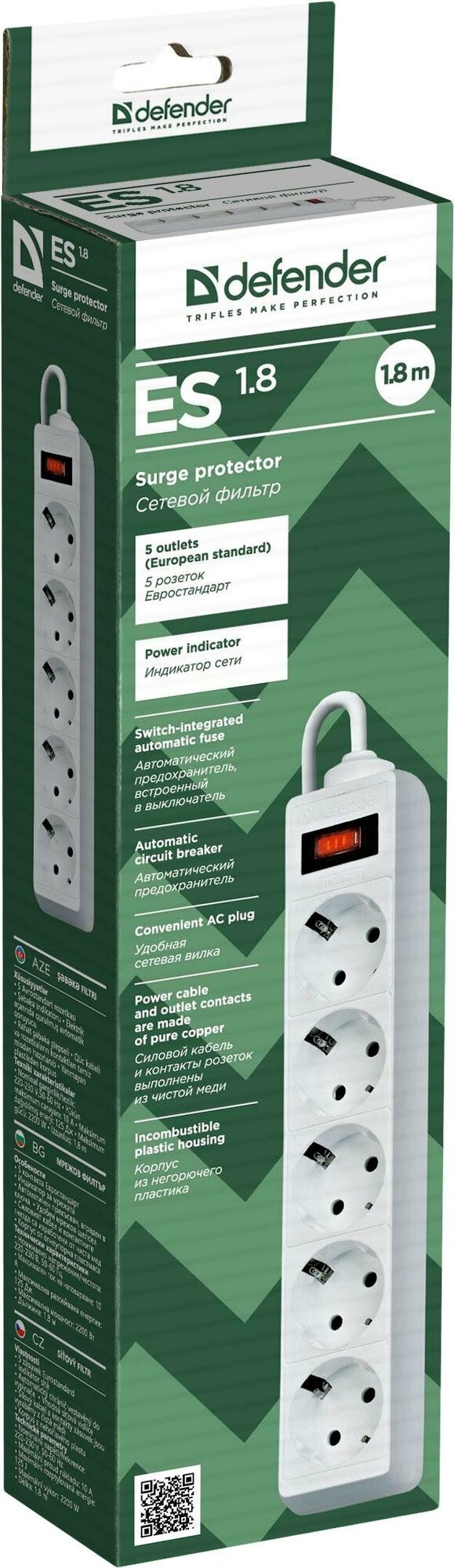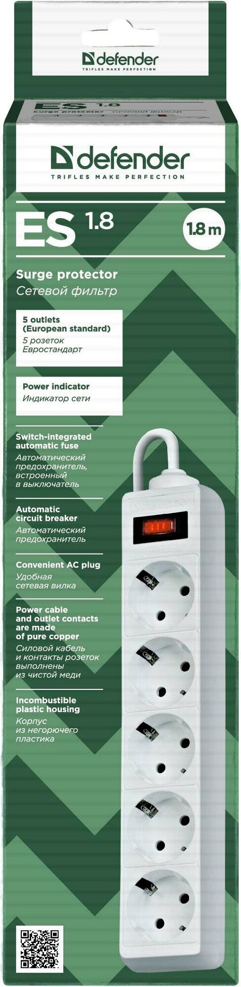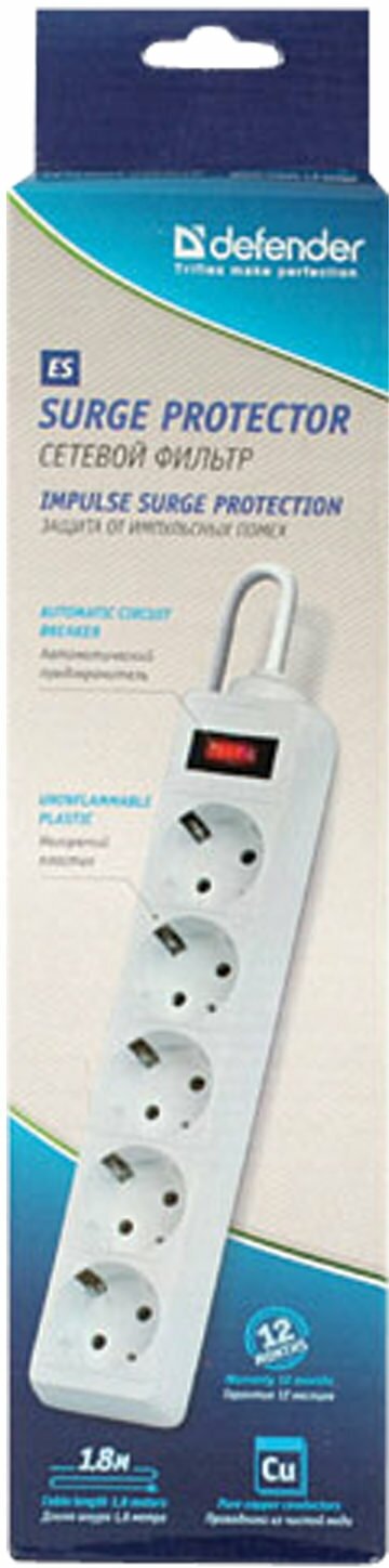 - Сетевой фильтр Defender ES 1.8 5 Sockets 1.8m White 99481