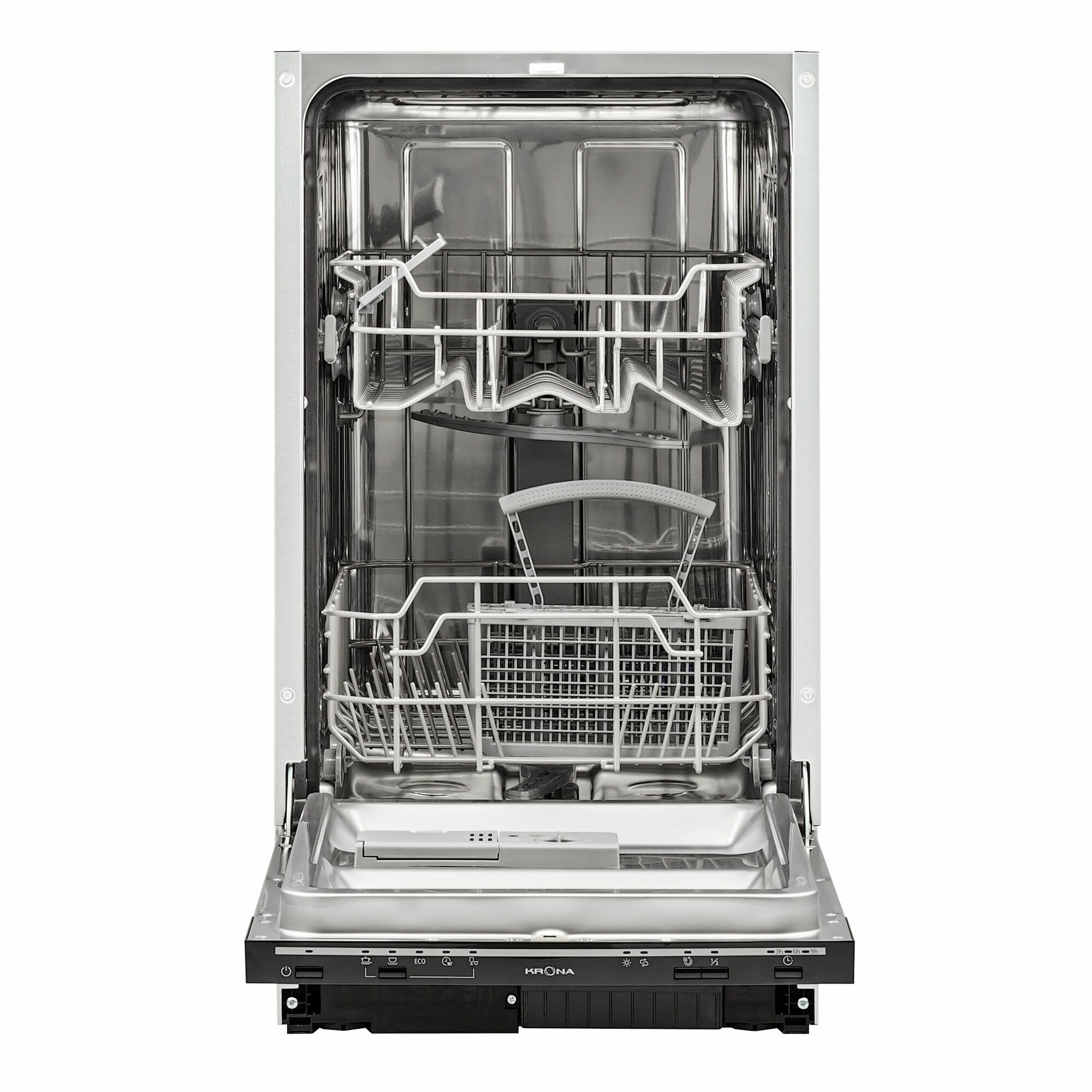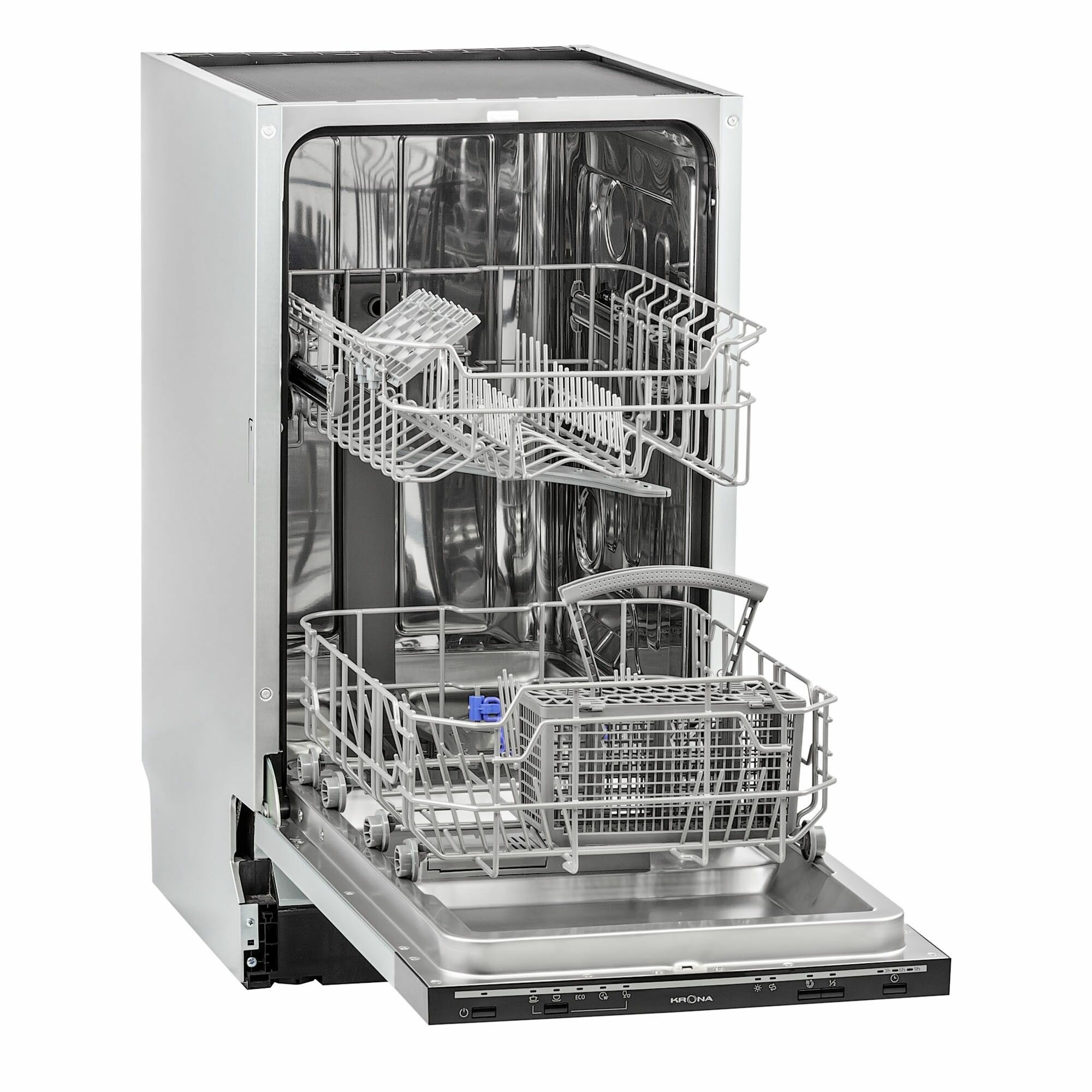 Встраиваемая посудомоечная машина Krona вмещает до 9 комплектов посуды и подходит для семьи от 3 человек. Модель имеет узкий корпус, благодаря чему станет отличным решением для небольшой кухни. Прибор получил 2 короба для посуды и корзину для столовых приборов, а также 5 программ мытья на выбор.