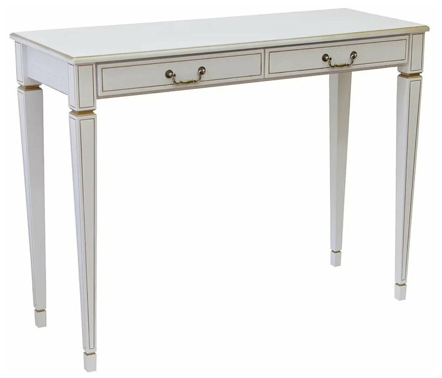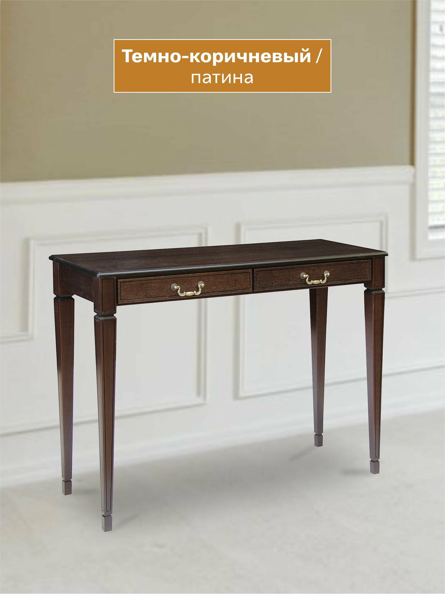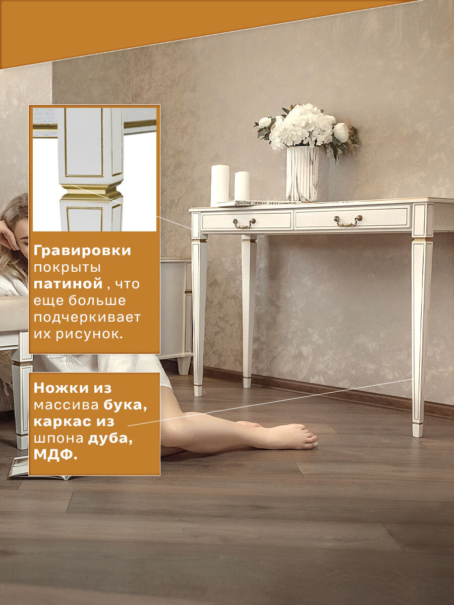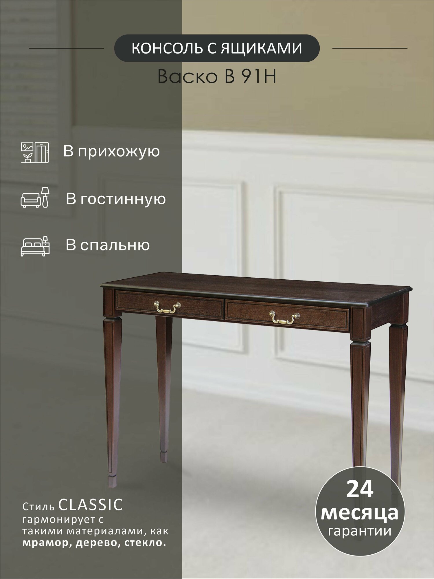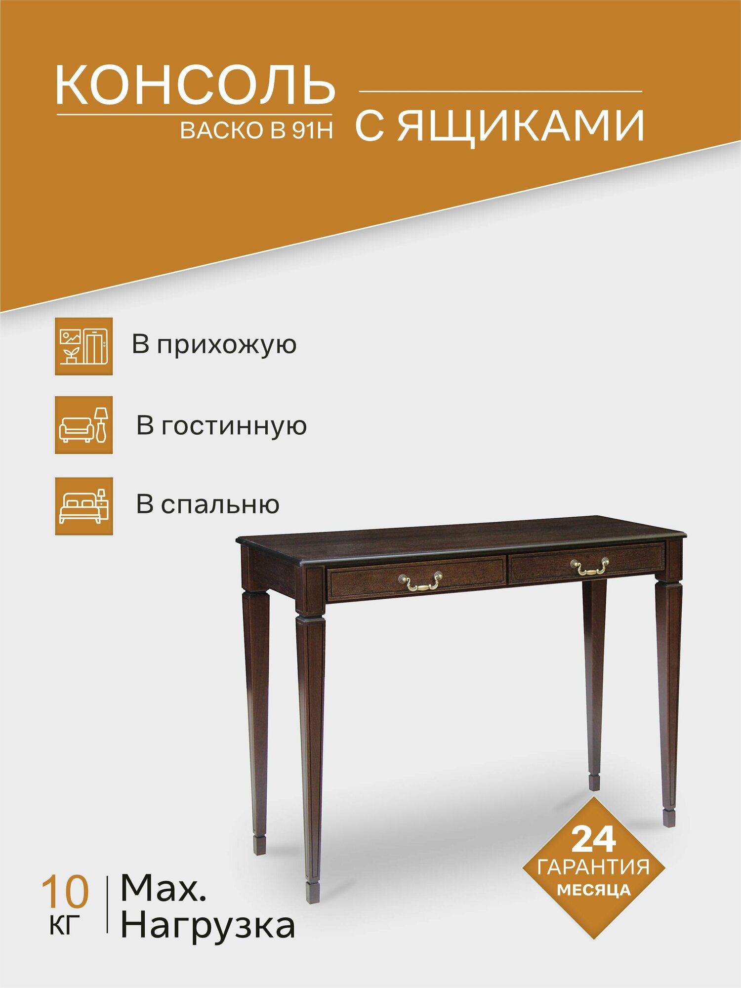 Классический консольный стол для оформления интерьера гостиной, прихожей, спальни. Конусообразные ножки с лаконичной гравировкой выполнены из массива бука. Все гравировки покрыты патиной в цвет золота, что еще больше подчеркивает их рисунок. Поверхность консоли шпонирована натуральным дубом, два выдвижных ящика. Надежная классическая конструкция, компактная упаковка, выверенные габаритные размеры. Предметы интерьера серии "Васко" консоль, журнальный стол, зеркало, банкетка, костюмная вешалка отлично дополняют друг друга создавая интерьер в стиле неоклассика.