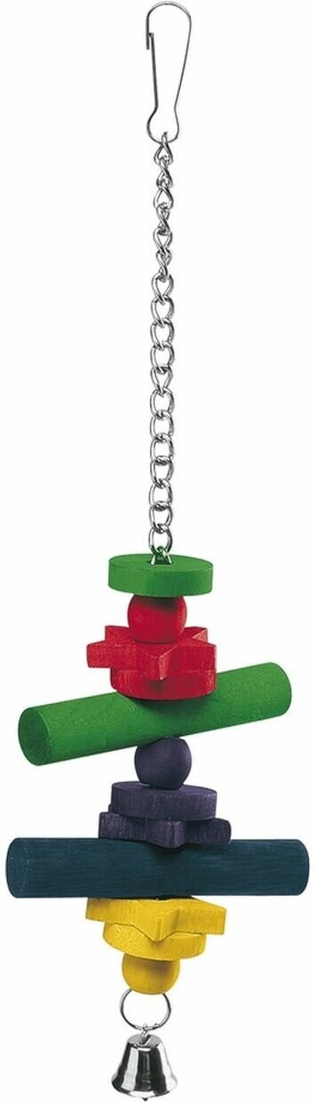 Игрушки представлены разными цветовыми вариантами и разными формами, оборудованы маленькими колокольчиками и металлической цепочкой с крючком для подвешивания к клетке.