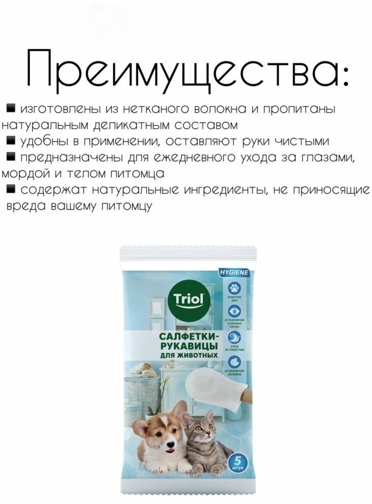 Экстра мягкие, антибактериальные салфетки-рукавицы - это быстрый и удобный способ содержать питомца в чистоте. Каждая очищающая салфетка изготовлена из нетканого волокна и пропитана натуральным деликатным составом (растительные экстракты, протеины, алоэ вера, ланолин, витамины А и Е, экстракт овсянки, пищевая сода). Салфетки-рукавицы рекомендованы: - для устранения неприятного запаха; - для очистки слезных пятен под глазами; - для быстрой очистки грязных лап; - при отсутствии возможности помыть животное из-за холода; - для животных, которые не любят воду; - для снижения вероятности появления аллергии у питомца; - для поддержания мягкости и блеска шерсти. Преимущества: - натуральные ингредиенты, не приносящие вреда животному; - помогает отрастить крепкую и здоровую шерть; - охлаждает и увлажняет; - успокаивает и защищает сухую и раздраженную кожу; - устраняет неприятные запахи. Размер салфетки- рукавицы: 26*17 см. В упаковке 5 шт.