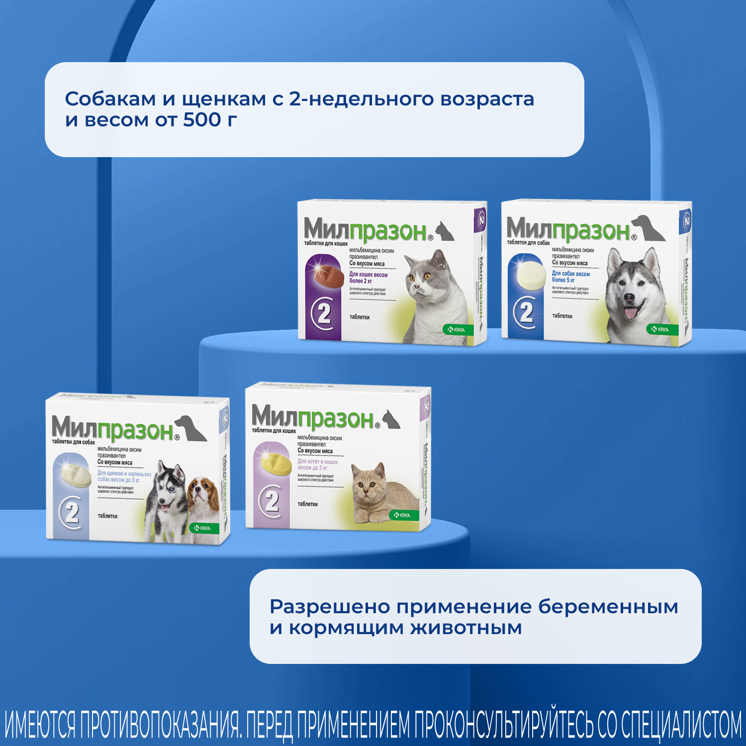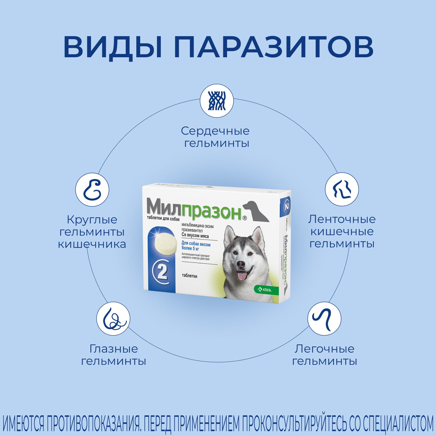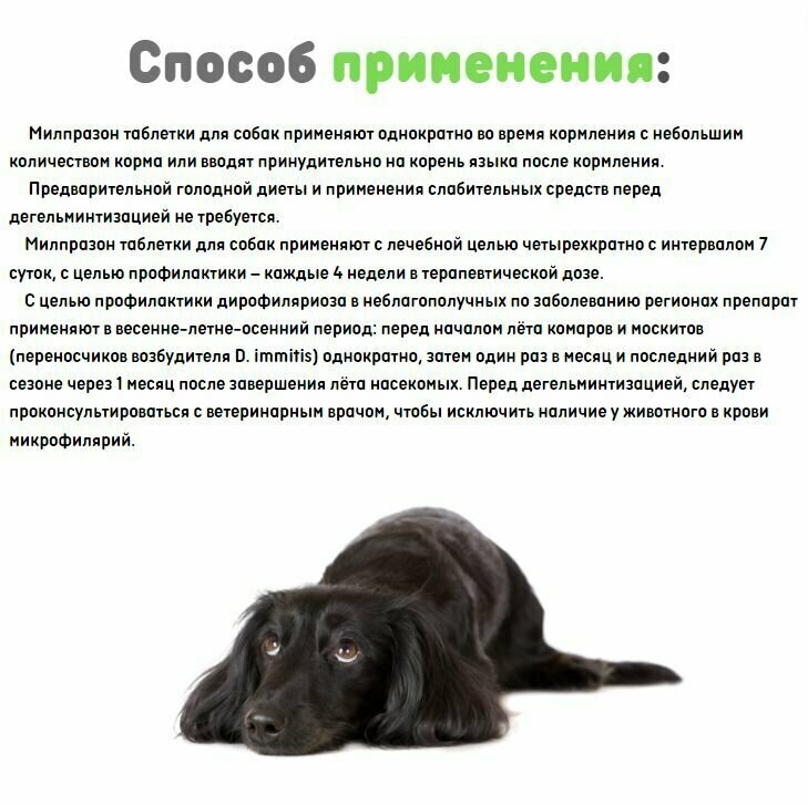 Милпразон таблетки для собак назначают с лечебной и профилактической целью при нематодозах, цестодозах и ассоциативных нематодо-цестодозных инвазиях, вызванных гельминтами следующих видов: цестоды – Dipylidium caninum, Taenia spp., Echinococcus spp., Mesocestoides spp.; нематоды – Ancylostoma caninum, Toxocara canis, Toxascaris leonina, Trichuris vulpis, Thelazia callipaeda; Angiostrongylus vasorum (снижает интенсивность заражения), Crenosoma vulpis (снижает интенсивность заражения), Dirofilaria immitis (профилактика заболевания).