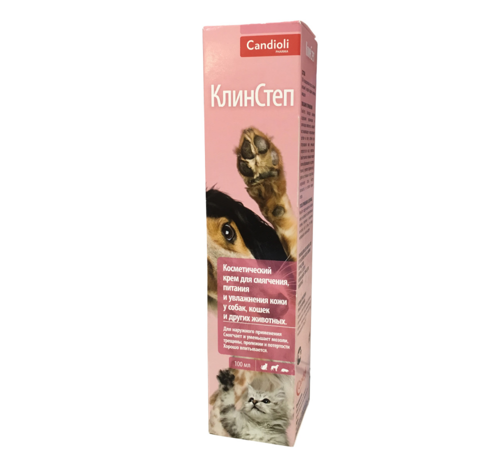 КлинСтеп крем косметический для увлажнения кожи.КлинСтеп - крем косметический для увлажнения кожи, который широко применяется ветеринарными врачами в качестве эффективного средства для восстановления целостности кожного покрова.Наши питомцы часто сталкиваются с негативными последствия неблагополучной экологии, а подчас и с деятельностью других людей. Горячий асфальт, реагент, рассыпанный в зимнее время по дорогам мегаполисов и просто повреждения кожного покрова требуют внимательного и бережного отношения. Идеальным решением станет использование крема КлинСтеп, который быстро впитывается и не оставляет жирной плетки уже спустя несколько минут после нанесения.В его состав входят ингредиенты, обеспечивающий максимальный терапевтический эффект:• Заживление повреждений кожного покрова, лап, носа и других частей тела.• Уменьшение воспалительных реакций в очаге поражения;• Легкий антисептический эффект, препятствующий развитию вторичной бактериальной инфекции;КлинСтеп - крем косметический для увлажнения кожи, который можно наносить несколько раз в течении дня по необходимости и мягко массируя пораженную область втирать в кожу животного.