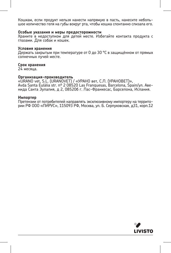 Способ применения: зубной гель Эксмайл плюс лучше всего наносить щеткой, но можно и наносить прямо без чистки. Следует применять как минимум 2-3 раза в неделю, хотя наилучшие результаты достигаются при ежедневном применении. Если чистить щеткой не представляется возможным, энзимный гель можно наносить прямо на зубы при помощи крышки-клапана. При возникновении трудности нанесения внутрь ротовой полости у кошек, нанести небольшое количество вокруг рта, для того чтобы кошка слизала гель. Подходит для собак и кошек.