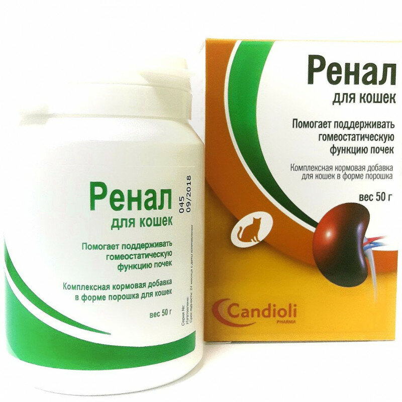 Кормовая добавка в виде порошка для улучшения обмена веществ, нормализации деятельности почек, в том числе при хронической почечной недостаточности.Компоненты препарата связывают излишки фосфатов в пище (карбонат кальция) и кальция в моче (цитрат калия), снижая их биологическую доступность; способствуют связыванию уремических токсинов (хитозан) и улучшению состояния животного. Карбонат кальция образует с фосфатами корма прочные нерастворимые соединения, помогает поддерживать баланс кальциево-фосфорного обмена в организме и оказывает алкализирующее действие. Цитрат калия связывает кальций в моче, предотвращая тем самым его кристаллизацию и образование почечных камней. Кроме того, цитрат калия предотвращает чрезмерную кислотность мочи, подщелачивая её. Хитозан связывает желчные кислоты в кишечнике животного, что способствует снижению уровня холестерина в сыворотке крови, а также повышает уровень гемоглобина в крови (что особенно актуально при часто развивающейся у пациентов с ХПН анемии). Хитозан снижает уровень уремических токсинов, креатинина и мочевины в сыворотке крови животного, улучшая аппетит и снижая уровень интоксикации организма. Вследствие применения Ренала улучшается функционирование почек и общее состояние животного, повышается продолжительность и качество жизни пациентов с ХПН.ПОКАЗАНИЯ К ПРИМЕНЕНИЮ:Ренал для кошек может использоваться как индивидуальный препарат, так и в сочетании с обычной терапией для лечения хронической почечной недостаточности и со специальными диетами при почечной дисфункции, предписанными ветеринаром.