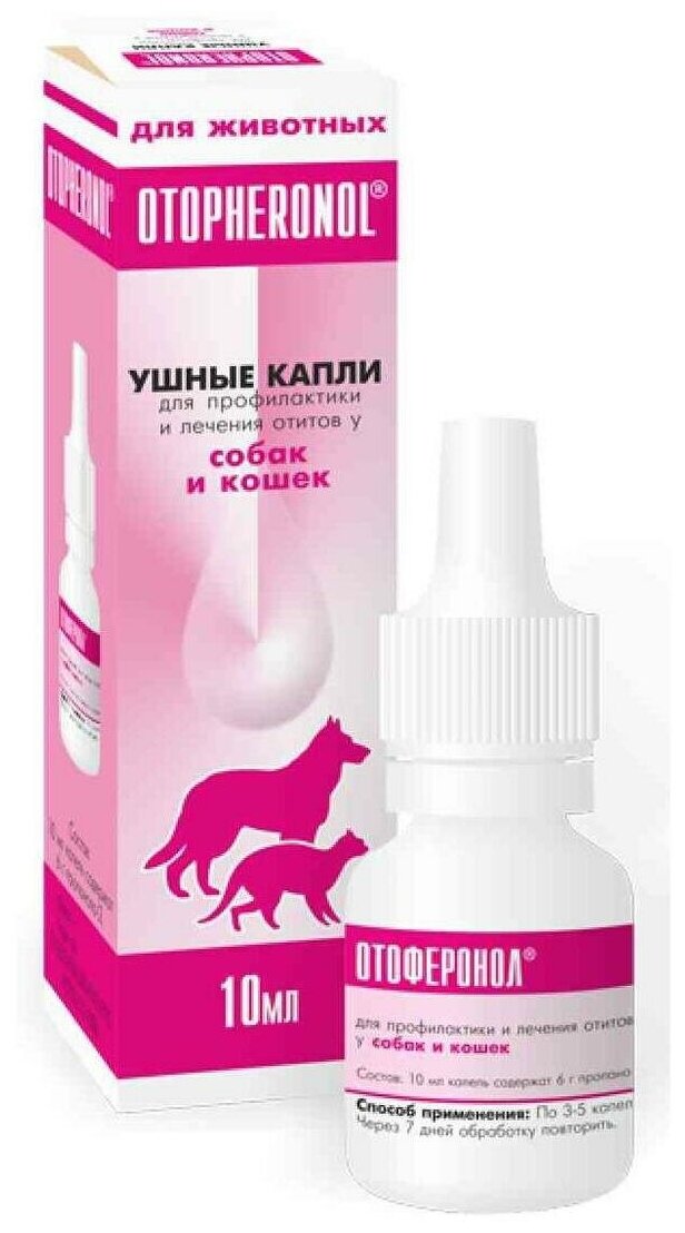 Отоферонол - противовоспалительный препарат в форме ушных капель предназначенный для профилактики и лечения наружных и средних отитов бактериальной этиологии собак и кошек, а также для гигиенической обработки ушей. состав И фармакологические свойства: циклоферон - 0,04% а также вспомогательные вещества: изопропиловый спирт полиэтиленоксид 400 вода дистиллированная Входящий в состав лекарственного препарата активный иммуномодулятор циклоферон, обладает широким спектром биологической активности – противовирусной, иммуномодулирующей, противовоспалительной. Вспомогательные компоненты способствуют ускорению очищения и заживления ран на раневой поверхности. дозировка И применение: Перед обработкой тщательно очищают ушные раковины от ушной серы, корок и струпьев тампоном, смоченным препаратом, а затем закапывают в каждое ухо по 3 - 5 капель препарата. С целью более полной обработки всей поверхности уха и слухового прохода, ушную раковину складывают вдоль пополам и слегка массируют ее основание. Обработку проводят один раз в день в течение 8 - 10 дней. При необходимости курс лечения повторяют после недельного перерыва. С профилактической целью обработку проводят однократно. противопоказания: Противопоказанием к применению препарата является индивидуальная непереносимость компонентов препарата. условия хранения: Хранят препарат в закрытой упаковке производителя, в защищенном от света и влаги месте, отдельно от пищевых продуктов и кормов при температуре от 0 0С до 20 0С. срок годности: Срок годности препарата при соблюдении условий хранения - 2 года со дня производства. упаковка: 10 мл особенности И преимущества В течение 16 лет заслуживает доверие миллионов владельцев по всей стране. Отоферонол - ушные капли, благодаря входящим в состав препарата активным компонентам обладает противовоспалительной и антимикробной активностью. Широкий спектр противомикробного действия. Позволяет мягко и эффективно бороться против стрептококков, стафилококков, протея и синегнойной палочки. Препаратом легко пользоваться даже в домашних условиях.