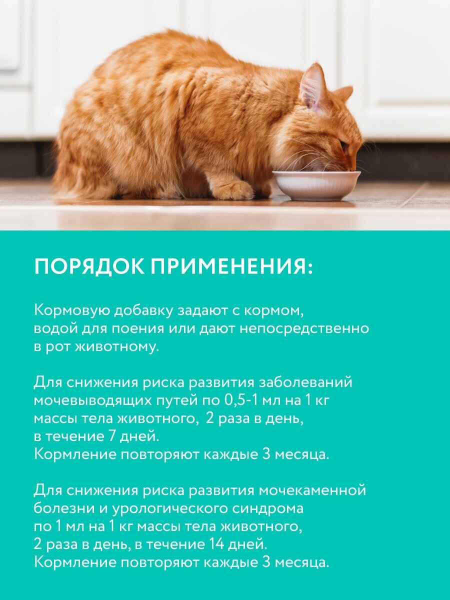- Для снижения риска развития мочекаменной болезни и урологического синдрома - по 1 мл на 1 кг массы тела животного, 2 раза в день, в течение 14 дней. Кормление повторяют каждые 3 месяца.