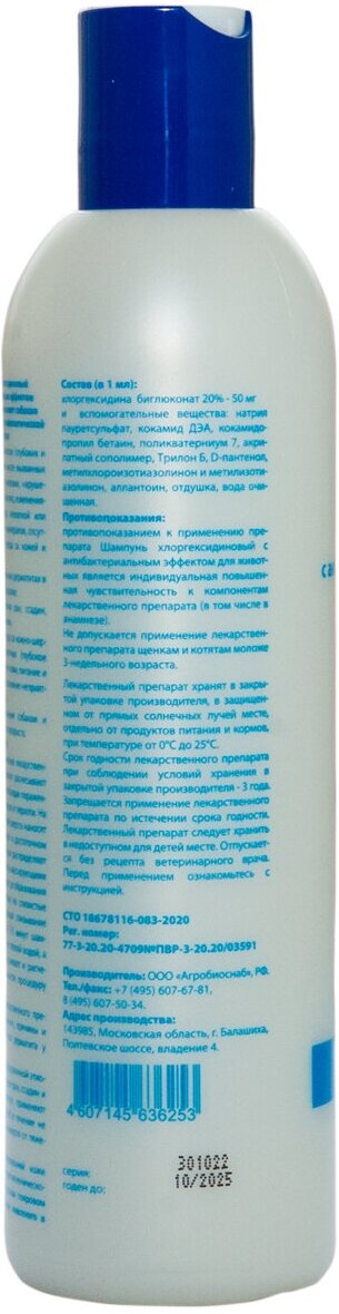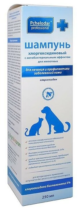 Шампунь Антибактериальный с хлоргексидином 5% для животных предназначен для гигиенического ухода за кожно-шерстным покровом животных, профилактики и лечения заболеваний кожи различной этиологии. Оказывает антисептическое, противобактериальное, противогрибковое, противозудное и дезодорирующее действие.