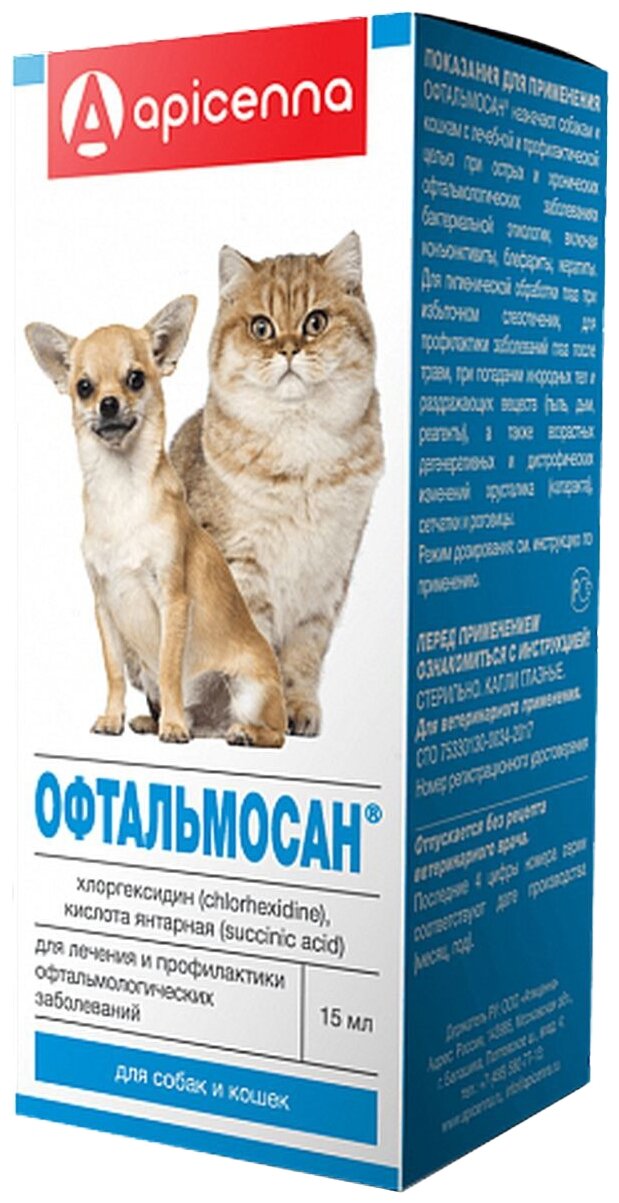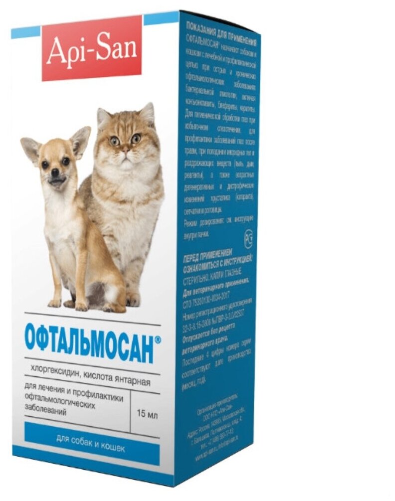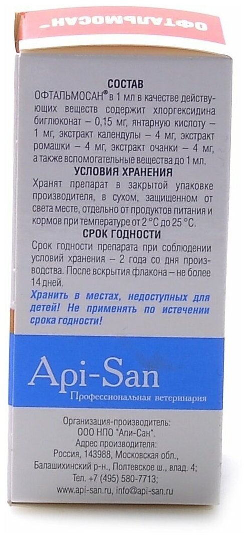 Офтальмосан назначают собакам и кошкам с лечебной и профилактической целью при острых и хронических офтальмологических заболеваниях бактериальной этиологии, включая конъюнктивиты, блефариты, кератиты. Для гигиенической обработки глаз при избыточном слезотечении, для профилактики заболеваний глаз после травм, при попадании инородных тел и раздражающих веществ (пыль, дым, реагенты), а также возрастных дегенеративных и дистрофических изменений хрусталика (катаракта), сетчатки и роговицы. Хранят препарат в закрытой упаковке производителя, в защищенном от прямых солнечных лучей месте, отдельно от продуктов питания и кормов при температуре от 2 ºС до 25 ºС. Противопоказанием к применению является гиперчувствительность животного к компонентам препарата. Офтальмосан не рекомендуется к применению при сухом кератоконъюнктивите. Срок годности лекарственного препарата при соблюдении условий хранения в закрытой упаковке производителя — 2 года со дня производства, после вскрытия флакона — 14 суток.