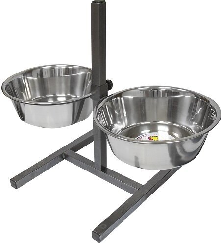 Подставка с регулируемой высотой в комплекте с мисками. Такие миски для собак на штативе сделаны из металла и удобны тем, что в процессе взросления животного высоту подставки можно регулировать. Кроме того, такая подставка подходит для любой породы – от мелкой до очень крупной. Для больших собак можно подобрать миски большего диаметра. Поддерживает подставку устойчивая опора.Преимущества металлических мисок на подставке:Никакие вредные вещества в пищу из них не выделяются;Миска для кормления является устойчивой, то есть миска не должна кружиться по полу и переворачиваться;Конструкция миски на подставке не дает корму высыпаться на пол;Снабжены фиксаторами для мисок, предотвращающими покачивание, вращение или перетаскивание мисок с места на место;Легко моется и сохраняет чистым пол под тем местом, где животное привыкла питаться. .Посуда из нержавеющей стали безопасна для здоровья.
