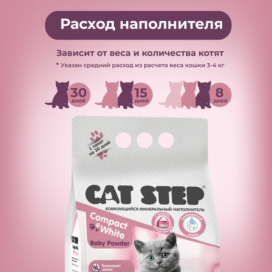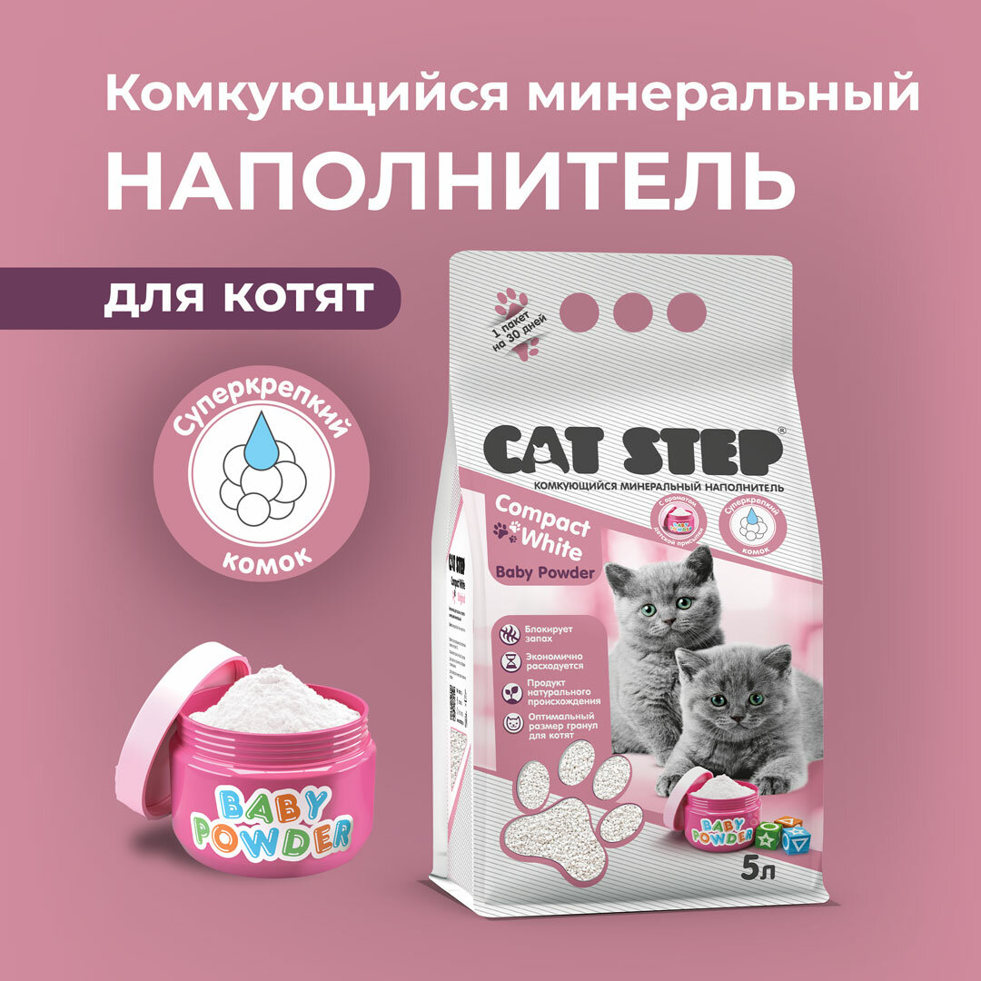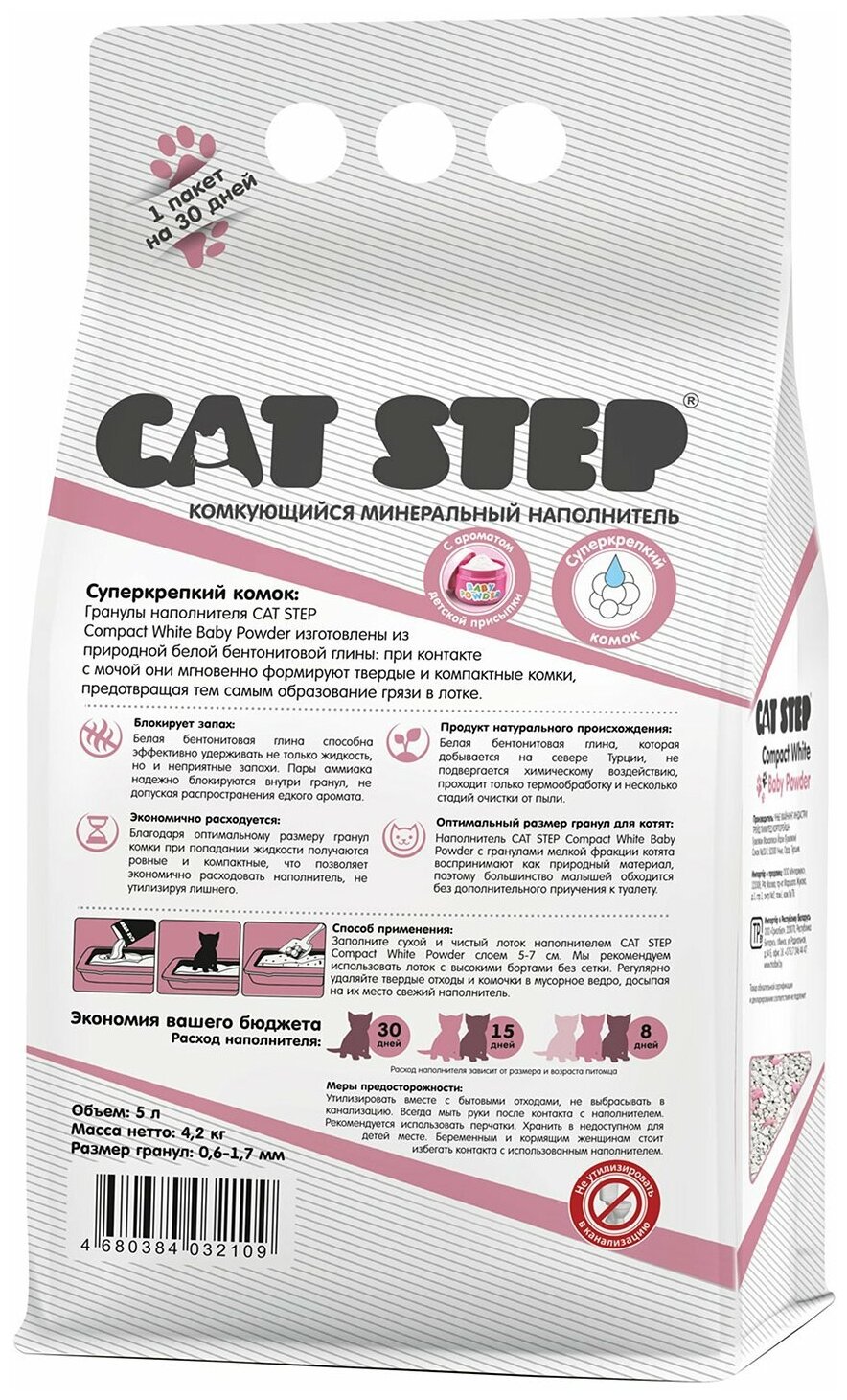 Наполнитель CAT STEP Compact White Baby Powder изготовлен из природной белой бентонитовой глины: при контакте с жидкостью гранулы мгновенно формируют твердые комки, предотвращая образование грязи в лотке и эффективно удерживая запахи.