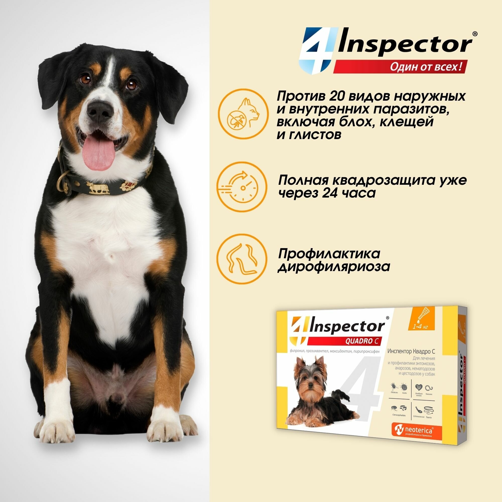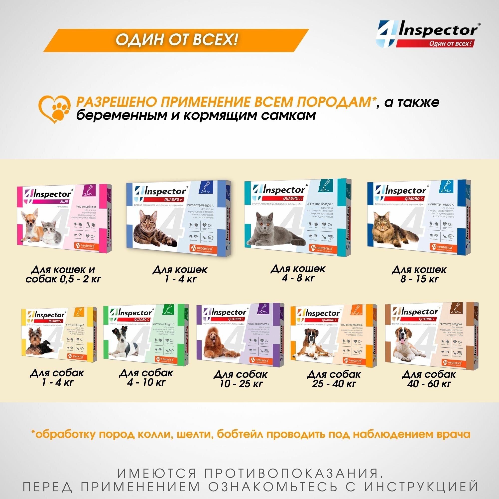 Inspector Quadro — Один от всех! Комплексный препарат против 20 видов внешних и внутренних паразитов.