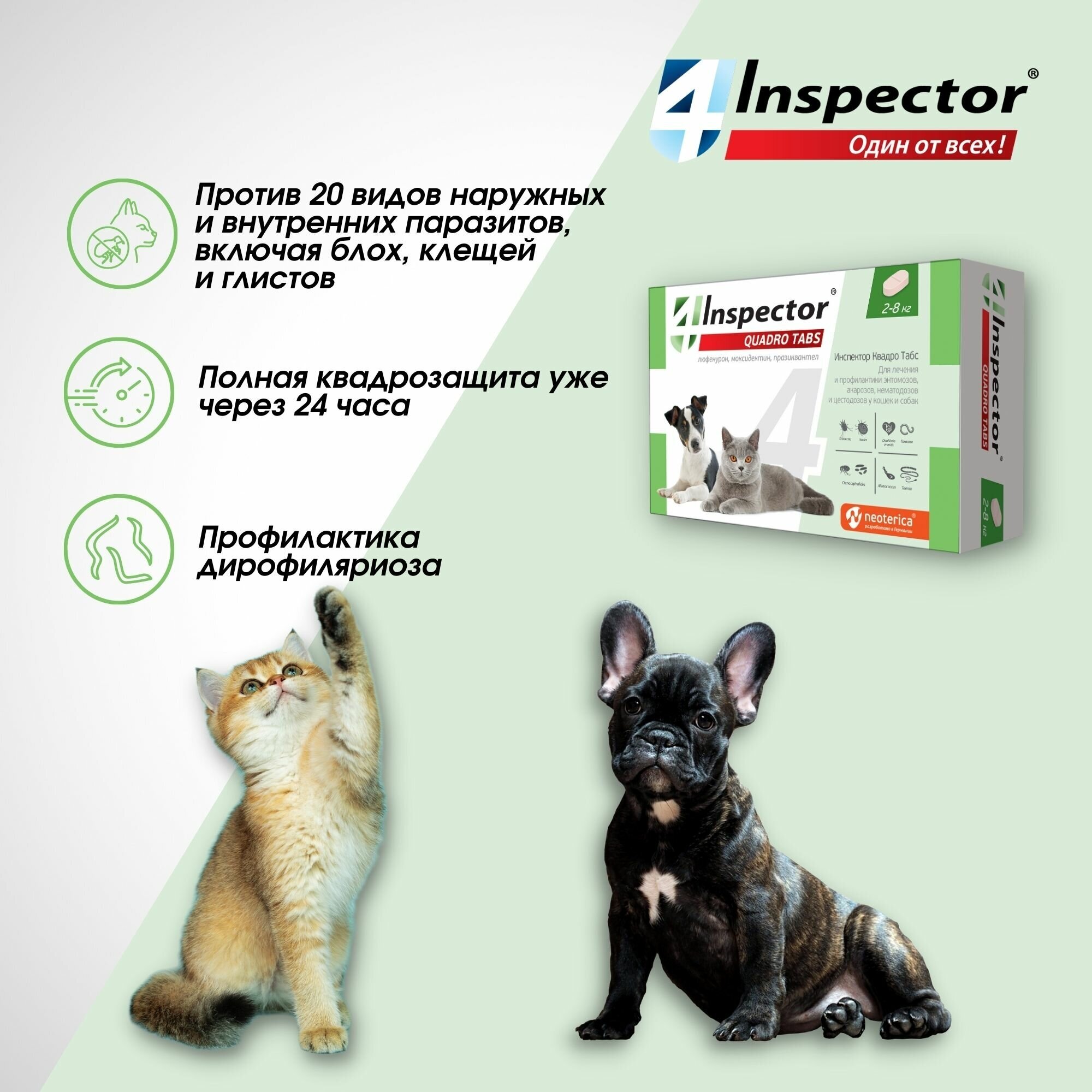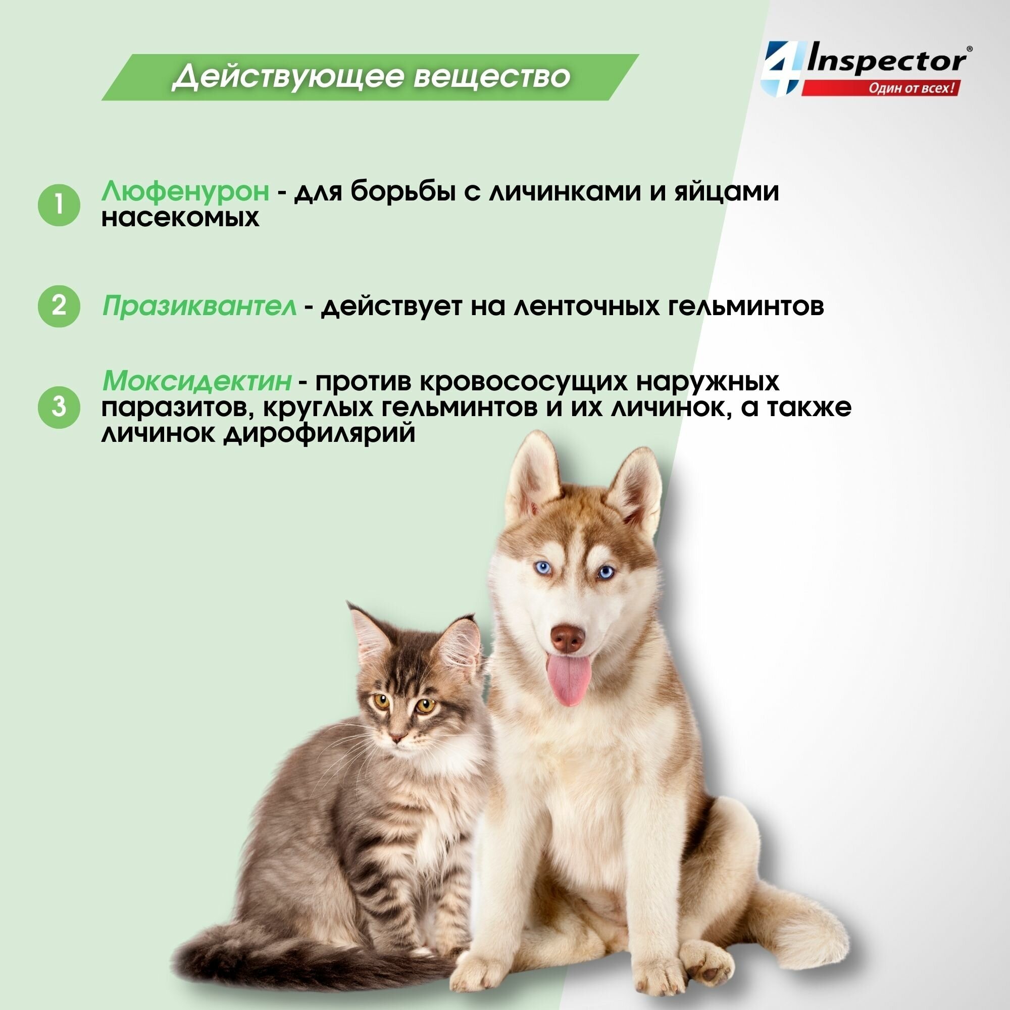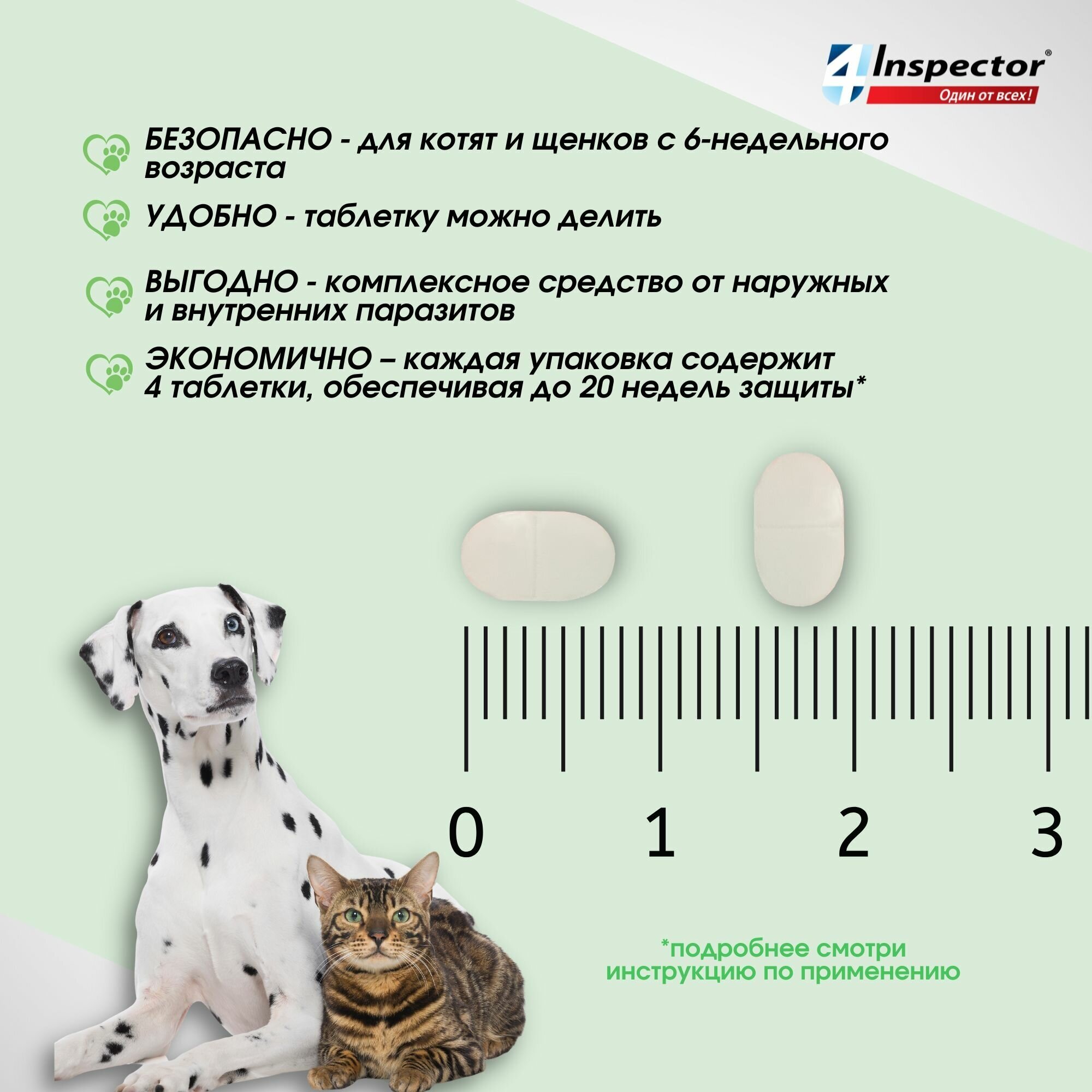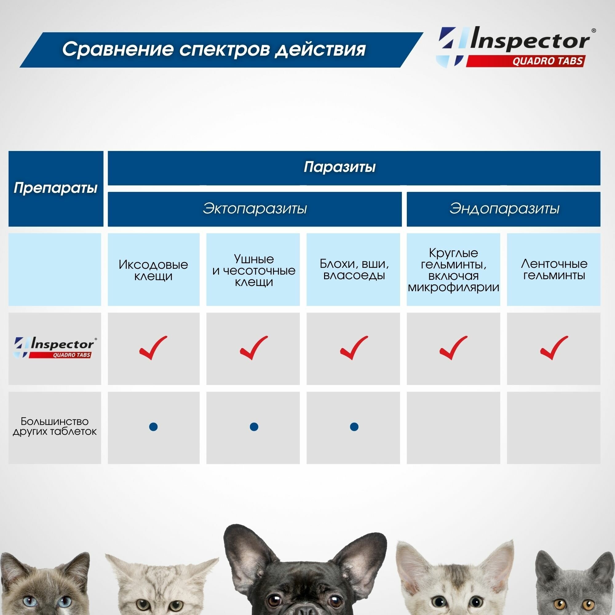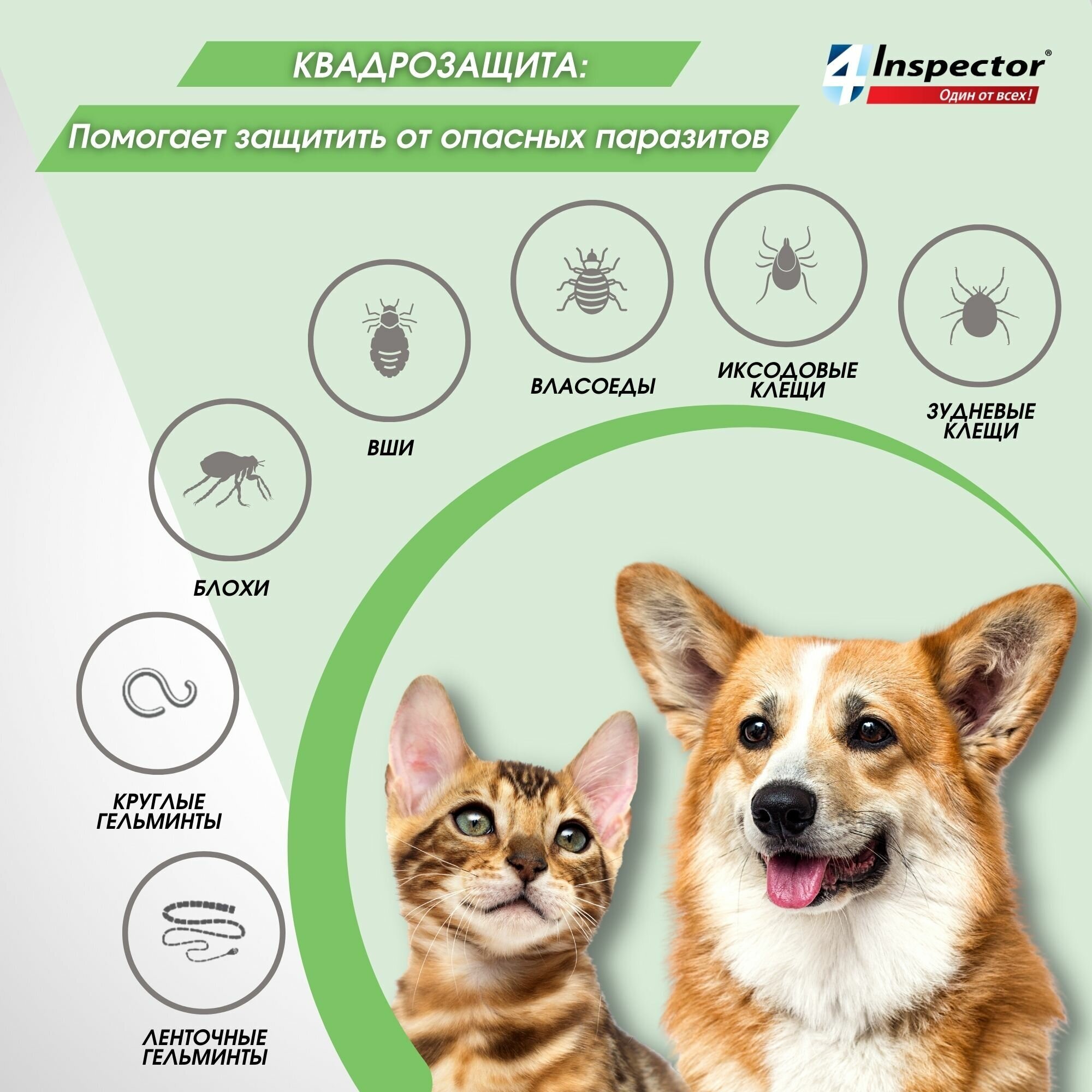 Одна таблетка Inspector Quadro Tabs защищает кошек и собак: