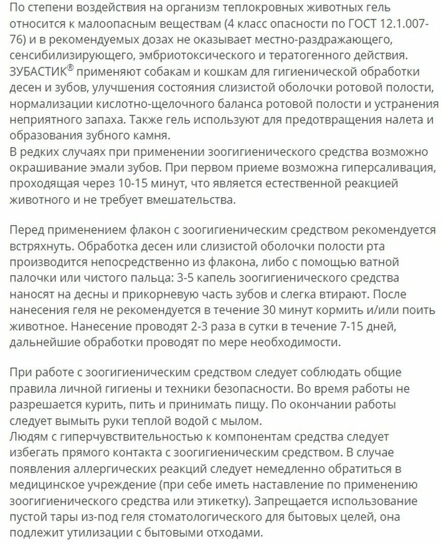 ЗУБАСТИК® применяют собакам и кошкам для гигиенической обработки десен и зубов, улучшения состояния слизистой оболочки ротовой полости, нормализации кислотно-щелочного баланса ротовой полости и устранения неприятного запаха. Также гель используют для предотвращения налета и образования зубного камня.