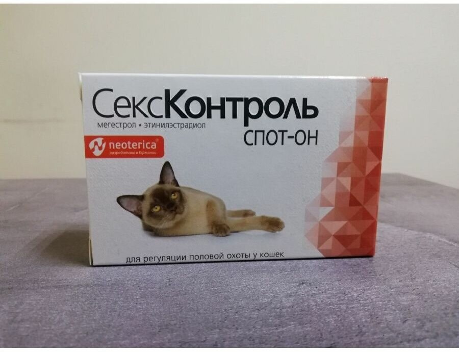 СексКонтроль спот-он капли на холку для регуляции половой охоты для кошек совершенно безопасны для здоровья вашего питомца, они не вызывают сенсибилизации (возникновения повышенной чувствительности к компонентам препарата) и не оказывают отрицательного влияния на печень. В результате действия гормона "мегестрола ацетат" у самок не наступает овуляция (если давать лекарство до начала течки), или прекращается течка (если давать лекарство в первые три дня от ее начала). Удобная форма применения ощутимо облегчает его использование, особенно для животных, не признающих лекарств.