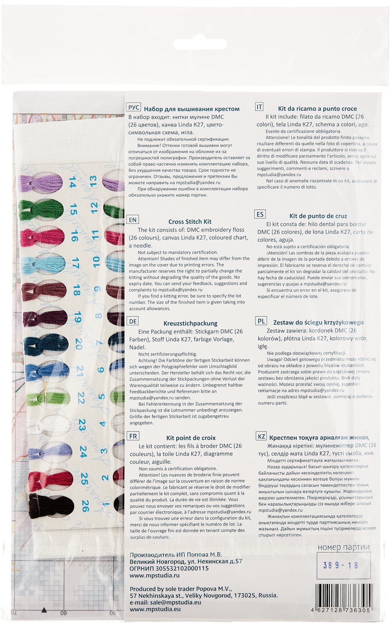 В состав набора входит: Ткань равномерного переплетения Zweigart (Linda 27), мулине DMC 26 цветов, разобранные на органайзере, цвето-символьная схема, игла, инструкция.