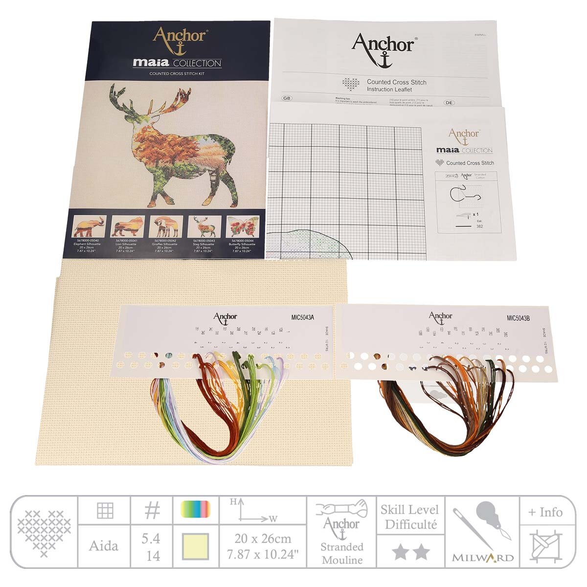 В наборе: канва Aida 14 кремовая, хлопковые мулине Anchor с органайзером, нитковдеватель, игла, цветная символьная схема, инструкция.