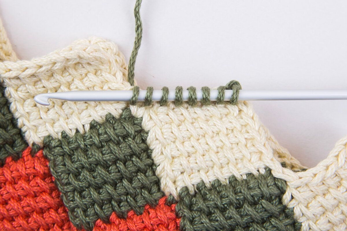 Длинный металлический крючок, с покрытием, с ограничителем на конце. Вязанное полотно имеет четкий узор, почти не растягивается и не деформируется после стирки. Вязание тунисским крючком производится только по одной лицевой стороне и этим отличается от вязки обыкновенным крючком. Тунисский крючок так же используется для многоцветного вязания с отделкой в виде узоров с геометрическими и растительными орнаментами. В этом случае можно воспользоваться схемами для вышивания крестом.