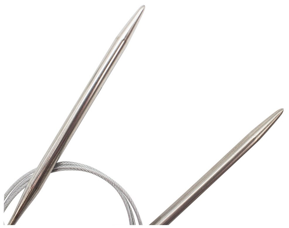 Круговые спицы из металлического сплава. Концы закруглены и не травмируют пальцы. Металлические спицы хорошо скользят, подходят для работы с тонкой пряжей – грубой шерстяной, из немерсеризованного хлопка, акриловой. Слегка закруглены на переходе к тросику для удобного перекидывания и снятия петель.Гибкий тросик также изготовлен из металла (общая длина – 100 см). Спицы используются для создания широкого полотна – ковриков, пледов и др. Незаменимы при бесшовном вязании свитеров, манишек и других вещей в круговой технике.