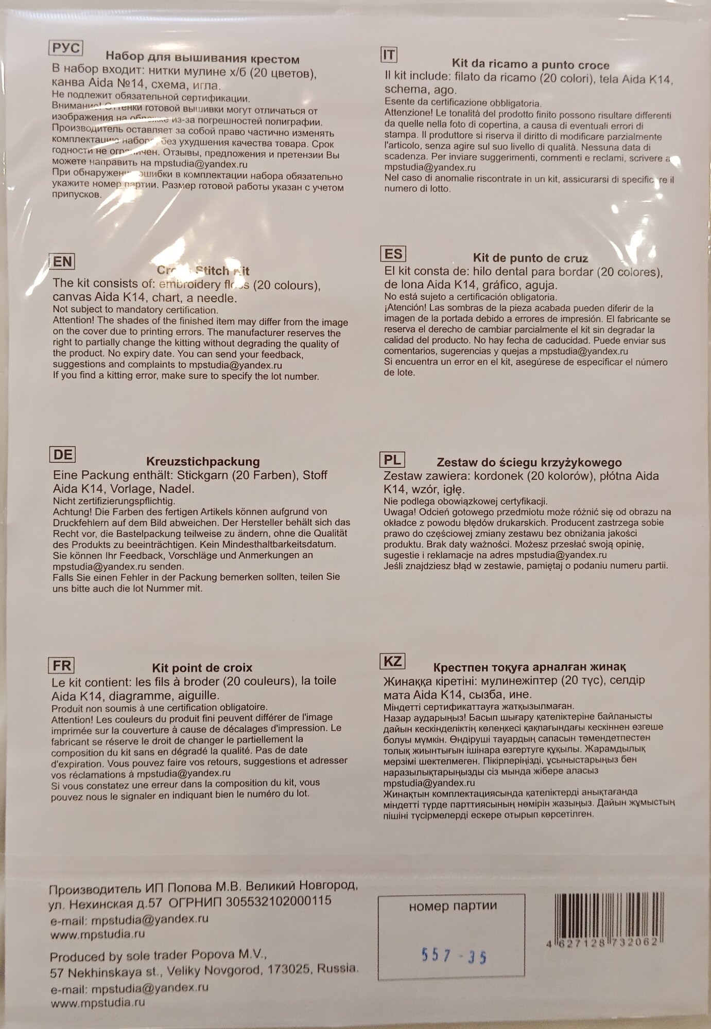 | В набор входит | канва 14 каунта, нитки мулине, разобранные на органайзере, схема и подробное руководство по вышиванию на 4-х языках. |