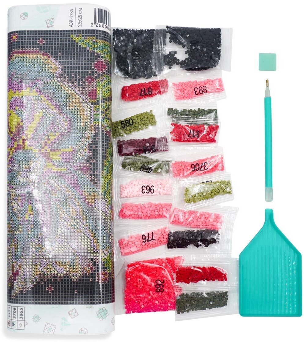 | В набор входит | полотно-схема с клеевым слоем, с условными обозначениями, инструкция, пластиковое блюдце, стилус, упакованные стразы |