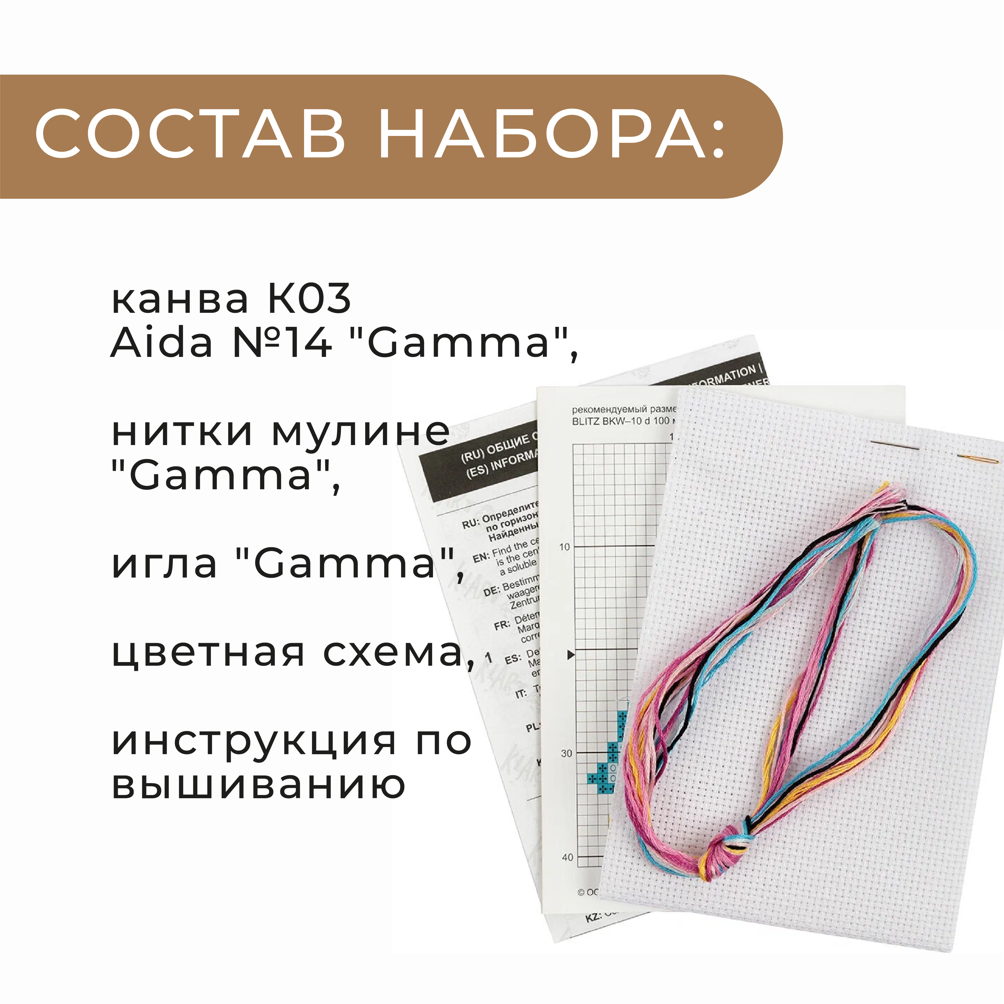 | В набор входит | канва Aida №14, нитки мулине "Gamma" на держателе, игла, цветная схема, инструкция по вышиванию |