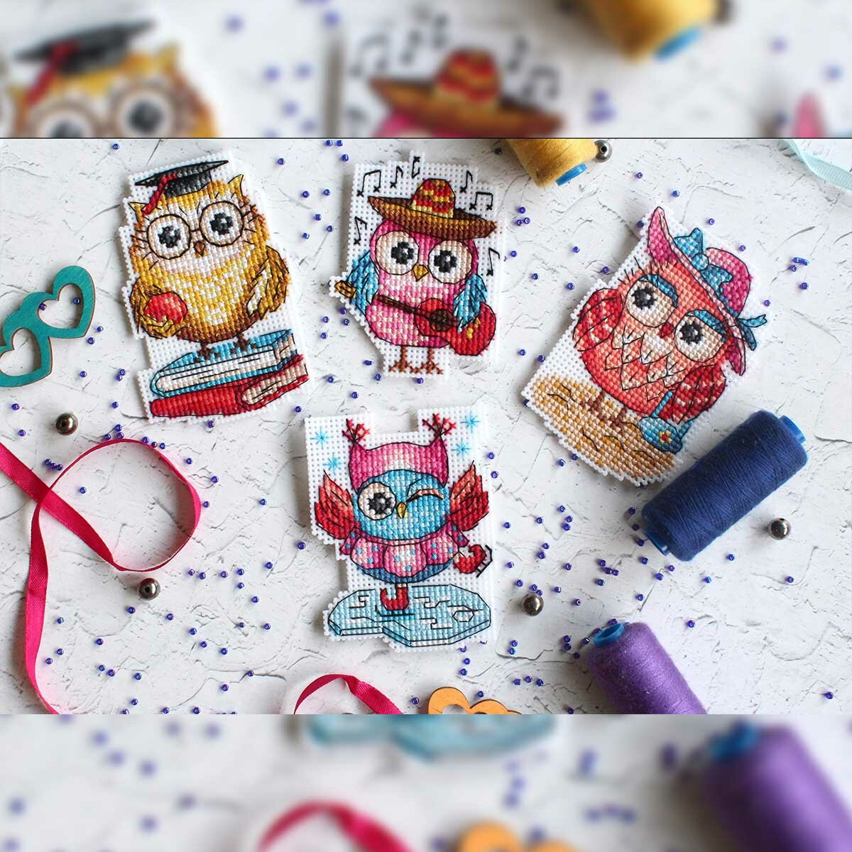 Вышитые магниты 'Совиные истории' на холодильник – это оригинальные сувениры и превосходный подарок. Чтобы сделать такой сувенир, достаточно владеть техникой 'крест'. Пяльцы или рамки не понадобятся – пластиковая канва отлично держит форму. Готовые элементы надо вырезать по контуру. К оборотной стороне фиксируется фетр, который маскирует изнанку, и затем фиксируется магнитное полотно.