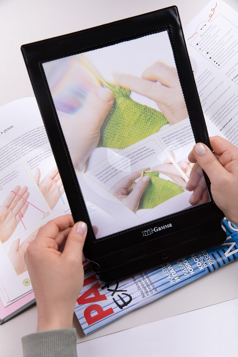 Плоская лупа имеет небольшую толщину - около 1 мм и изготовлена из гибкого пластика (ПВХ). Коэффициент увеличения линзы - х3. Эту лупу удобно использовать для чтения книг и газет, изучения схем большого формата, потому что она имеет большую линзу размером 22 х 16 см. При чтении держите лупу на небольшом расстоянии от текста.