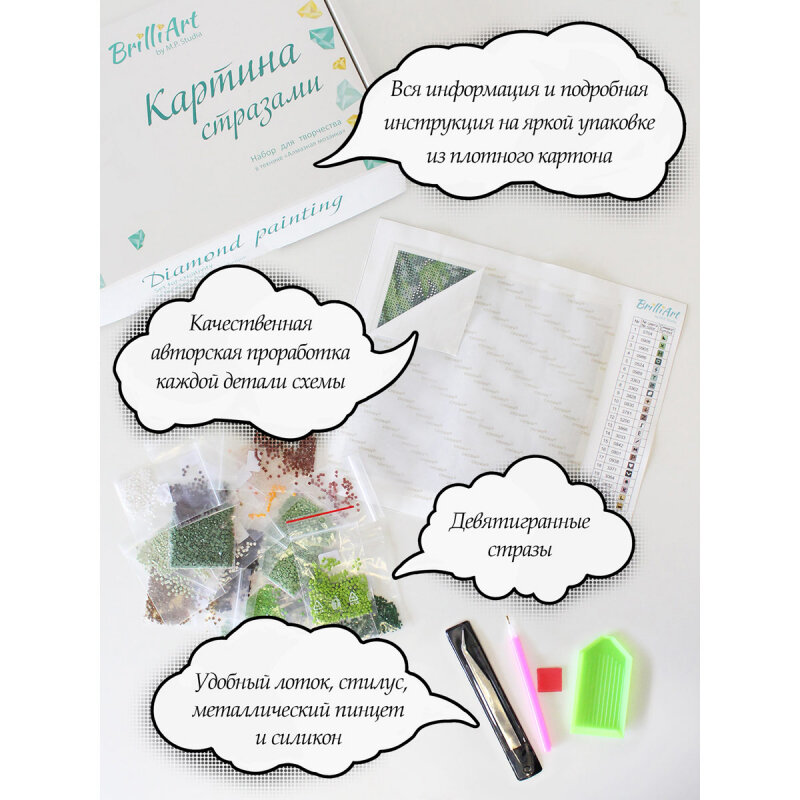 | В набор входит | Холст с клеевым слоем и условными обозначениями (схема), акриловые клеевые стразы 2,5*2,5 мм - 26 цветов, стилус, пинцет, контейнер для страз прямоугольный, контейнер для страз треугольный, силикон, инструкция. |