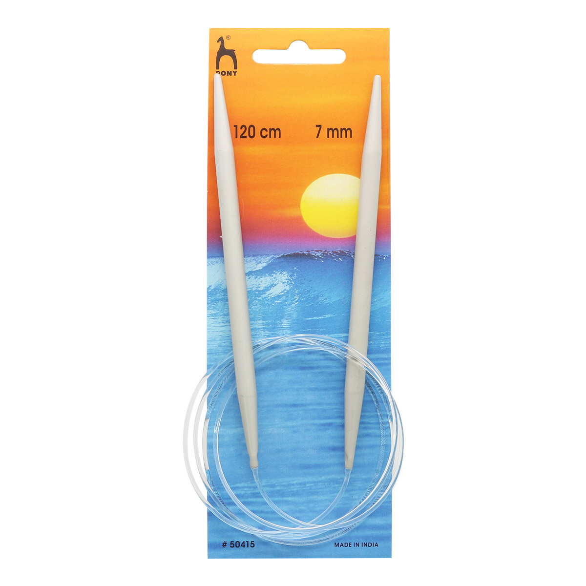 Удобные круговые спицы Pony с гибким тросиком. Слегка искривлены на переходе к тросику для удобного перекидывания и снятия петель. Вязальные спицы PONY изготовлены из алюминия высокого качества со специальной обработкой. Благодаря электролитическому оксидированию металла спицы имеют оптимальную для вязания гладкую поверхность, отличаются высокой прочностью и упругостью, идеально защищены от коррозии. Циркулярные спицы незаменимы при бесшовном вязании носков, рукавов, высоких воротников, манжет, манишек и других вещей в круговой технике. PONY – это всемирно известный индийский бренд, продукция которого востребована на всех континентах мира и славится своим высоким качеством и разнообразным ассортиментом товаров. Спицы - это практичный подарок для вязальщицы, она по достоинству оценит их безупречное качество. Желаем вам ровных петелек! Общая длина: 120 см Диаметр спицы: 7 мм