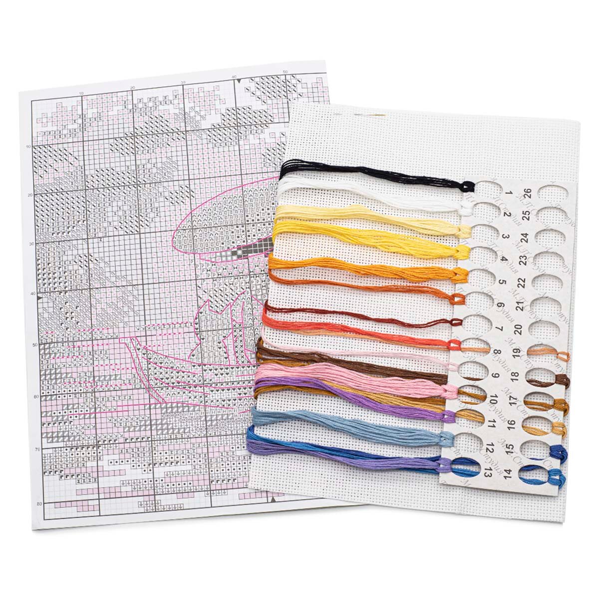 В наборе: канва Aida 14, нитки мулине, игла, двухцветная символьная схема, подробная инструкция на 8 языках.