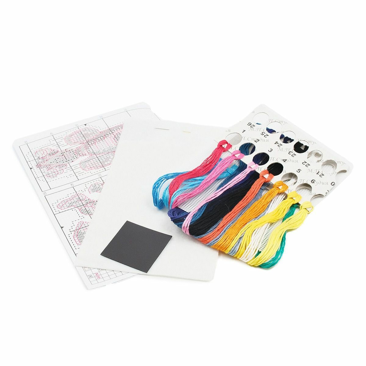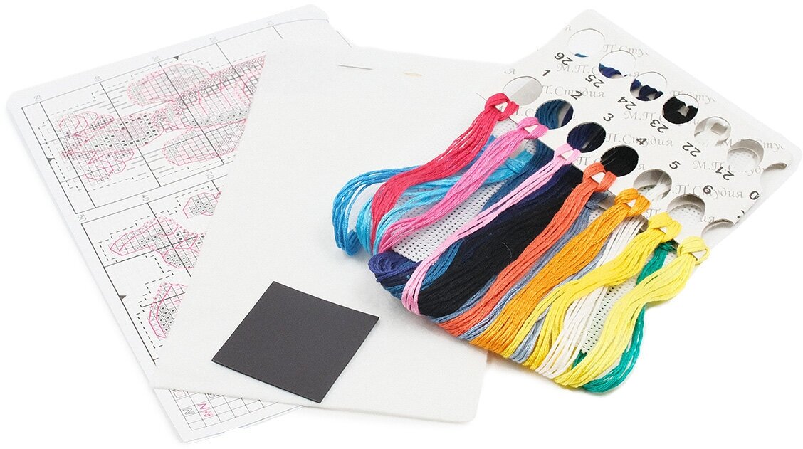 | В набор входит | пластиковая канва, нитки мулине 18 цветов, фетр белого цвета. магнитное полотно, игла, двухцветная схема для четырех сюжетов и руководство по вышиванию. |