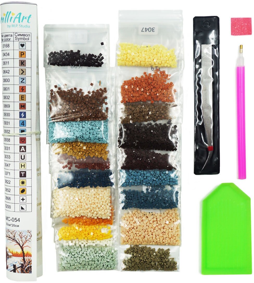 | Комплектация | Холст с клеевым слоем и нанесенной схемой, акриловые стразы (9 граней) в пакетиках, стилус, пинцет, контейнер, силиконовая подушечка, инструкция. |
