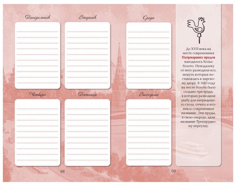 Еженедельник недатирован 'Моя Москва' (Пушкинская площадь, бирюз) 99906534Недатированный еженедельник с атмосферными иллюстрациями, на которых изображены самые известные и любимые уголки Москвы! В нем вы сможете не только делать рабочие и личные записи, но и узнавать интересные факты о столице и ее истории. Почему пруды называют Чистыми? Как Кремль исчез из поля зрения фашистов летом 1941 года? В какой песне группы Scorpions упоминается Парк Горького? Как в вагоне метро определить на слух, в какую сторону едет поезд? Где интересно провести свободное время? Ответы на эти и многие другие вопросы скрыты под обложкой нашего еженедельника! Формат - A5, размер: 140x210 мм, количество листов 64 (128 страниц), блок в 4 краски. Твердый переплет, компактный формат, плотная бумага, закладка-ляссе и матовая ламинация - все это позволит пользоваться еженедельником с особым удовольствием.