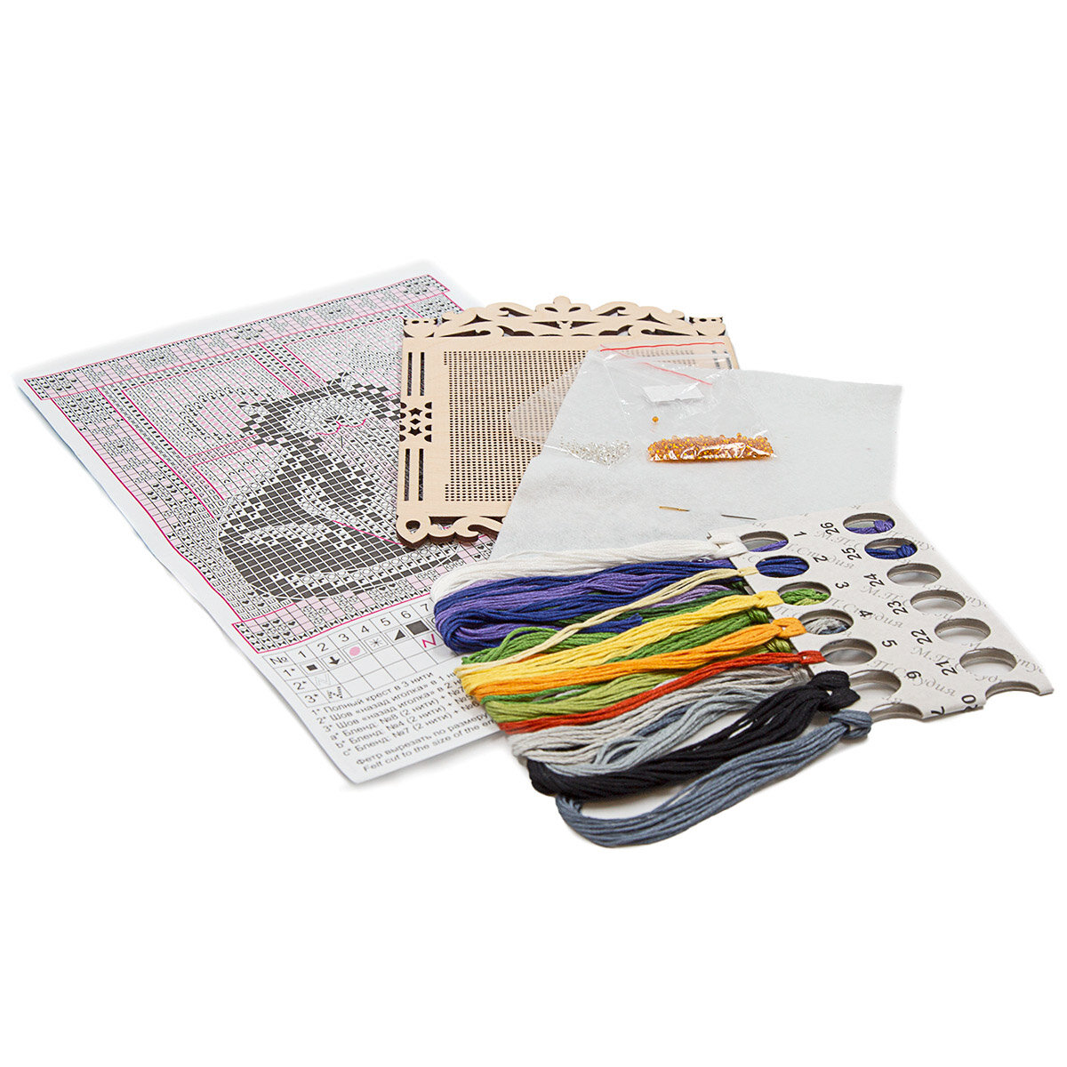 | В набор входит | перфорированная основа из фанеры 4 мм., мулине производства ПНК имени Кирова(15 цветов) разобраны на органайзер, чешский бисер первого сорта Preciosa (2 цвета), белый фетр для обработки изнаночной стороны (толщина 1 мм.), бумажная двухцветная символьная с |
