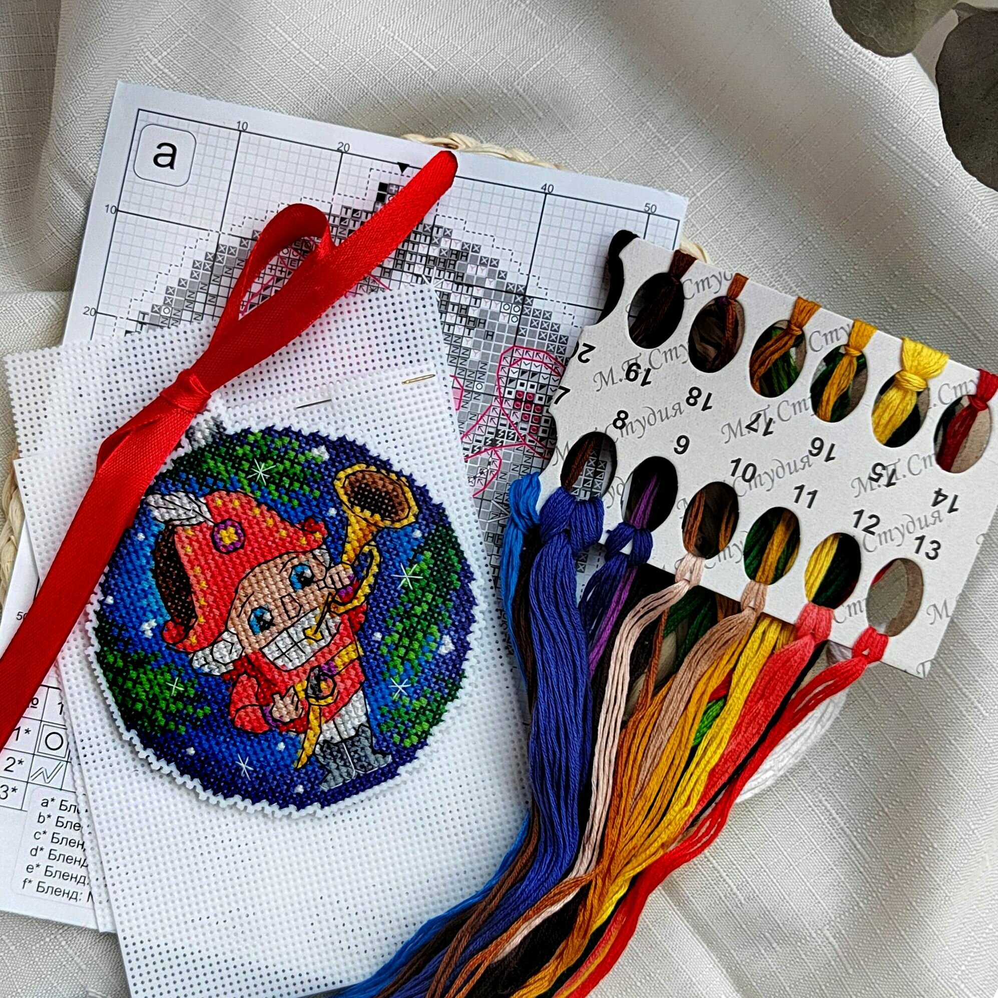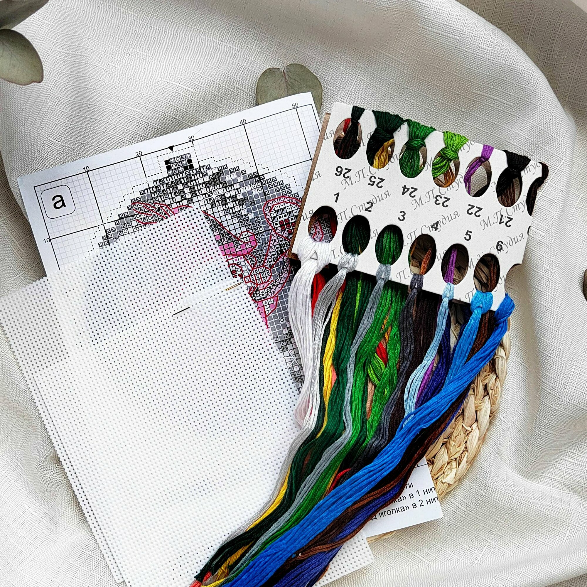 В наборе: канва пластиковая Aida №14, нитки мулине, разобранные на органайзере, игла, схема и инструкция.