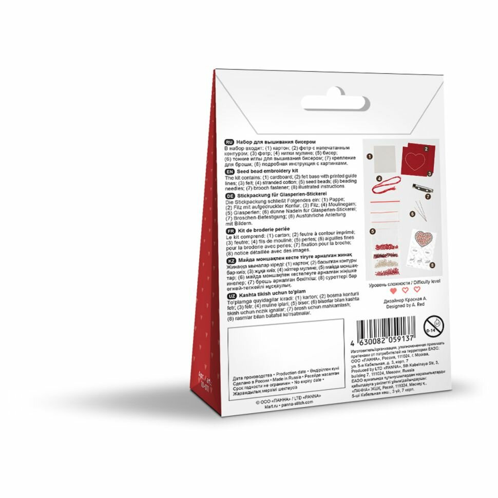 | В набор входит | заготовка из картона, заготовка для броши, мулине, бисер, фетр, инструкция с пошаговыми иллюстрациями |