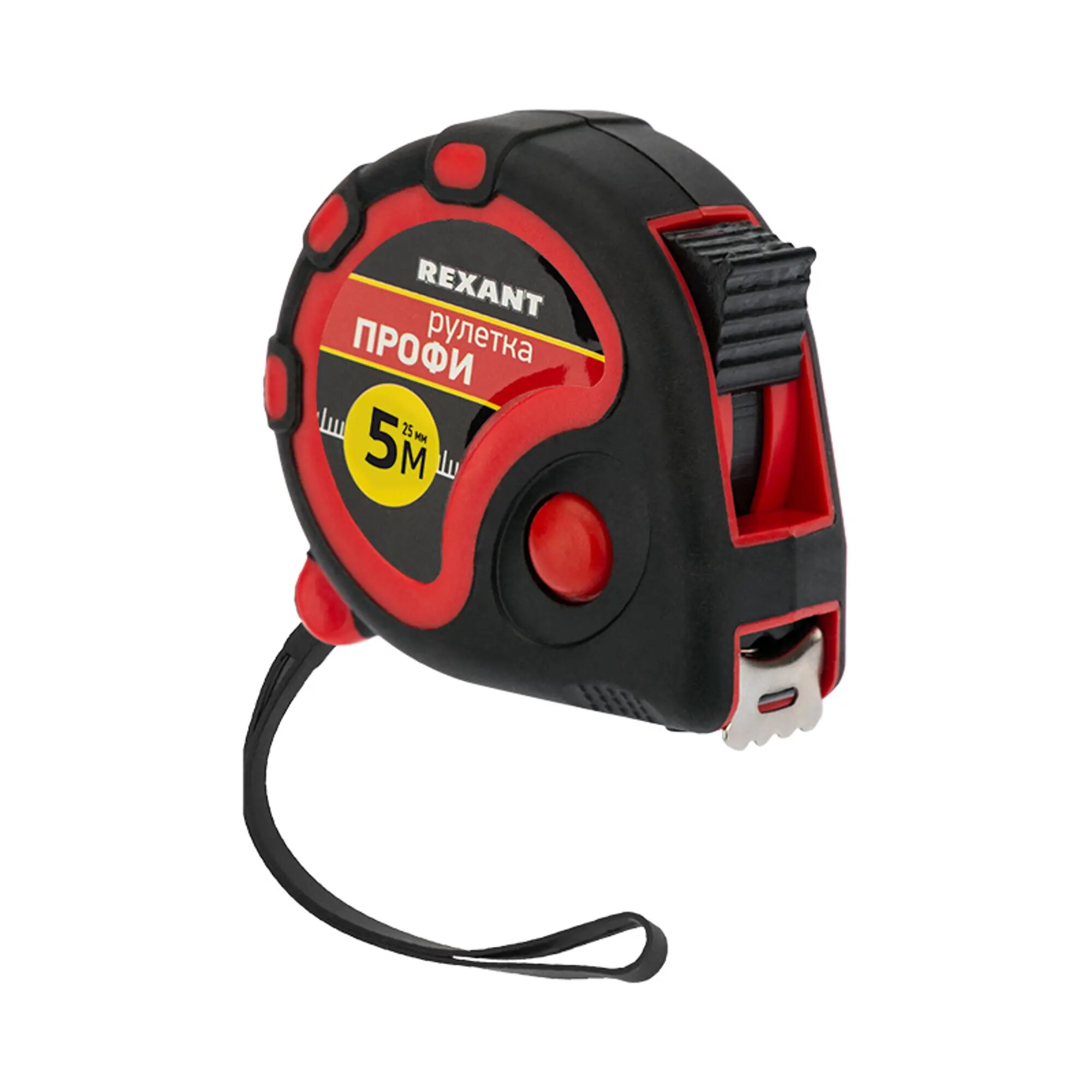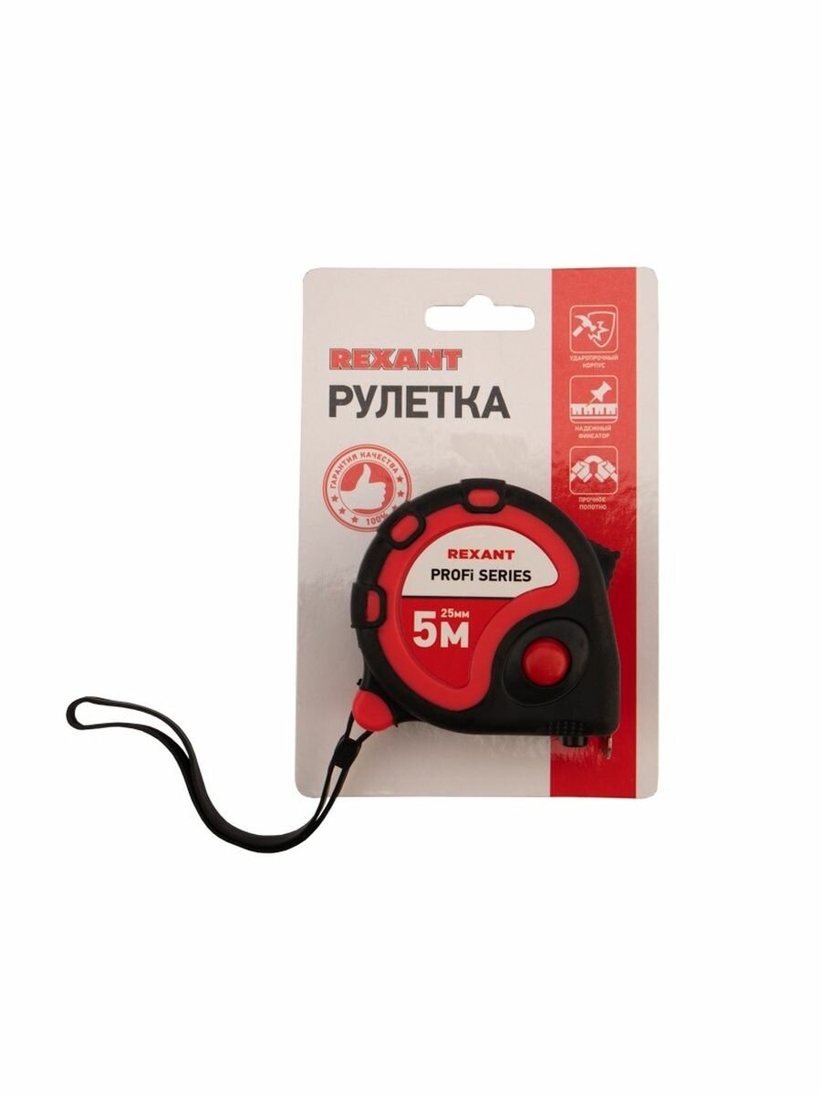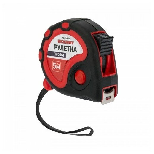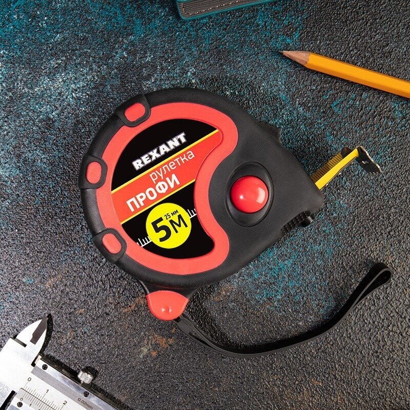 Измерительная рулетка REXANT «Профи» необходима при проведении измерительных работ в строительстве, хозяйстве, ландшафтных и геодезических исследованиях. Эргономичный прорезиненный корпус выполнен из ударопрочного пластика, не скользит в руках. Для удобства использования рулетки предусмотрены кнопки стопора и фиксации тормоза. Полотно обладает удобным зацепом с отверстием посередине. На корпусе расположена клипса-зажим для фиксации рулетки на ремне, кармане или поясной сумке. Ремешок позволяет надевать инструмент на запястье, чтобы освободить руки для работы.