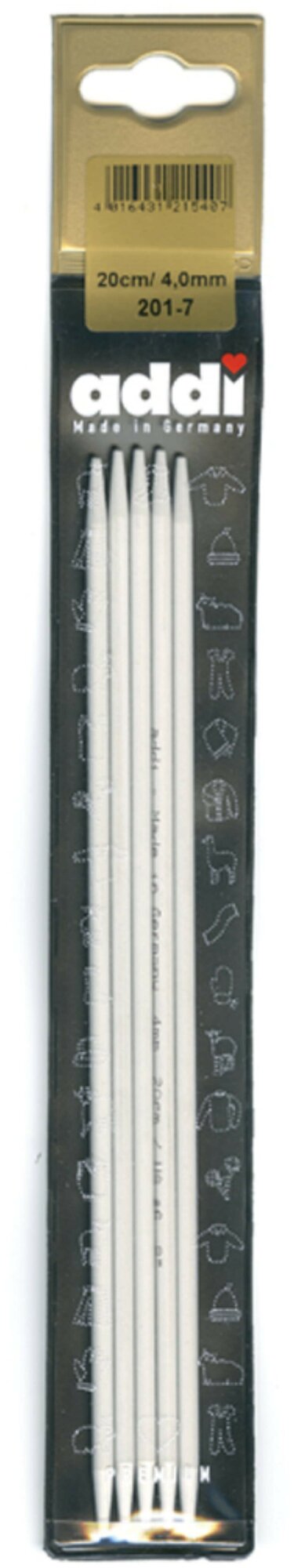 Спицы, чулочные, алюминий, N4,0, 20 см. 5 шт в блистере N4 Солидные и легкие чулочные спицы из высококачественного алюминия addi обладают прекрасными тактильными качествами и благородным серебристо-матовым цветом. Уникальный стук при вязании радует слух. За счет гладкой поверхности работать с ними легко и удобно. На саму спицу, как и на других артикулах, нанесен размер, длина и знаменитое "Made in Germany".